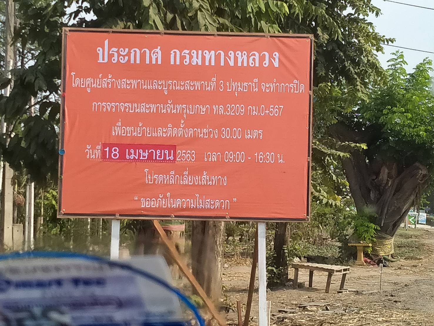 ประกาศ กรมทางหลวง โดยศูนย์สร้างสะพานและบูรณะสะพานที่ 3 ปทุมธานี จะทำการปิดการจราจรบนสะพานจันทรุเบกษา ทล.3209 กม.0+567 เพื่อขนย้ายและติดตั้งคานช่วง 30.00 เมตร วันที่ 18 เมษายน 2563 เวลา 09:00 - 16:30 โปรดหลีกเลี่ยงเส้นทาง "ขออภัยในความไม่สะดวก"
