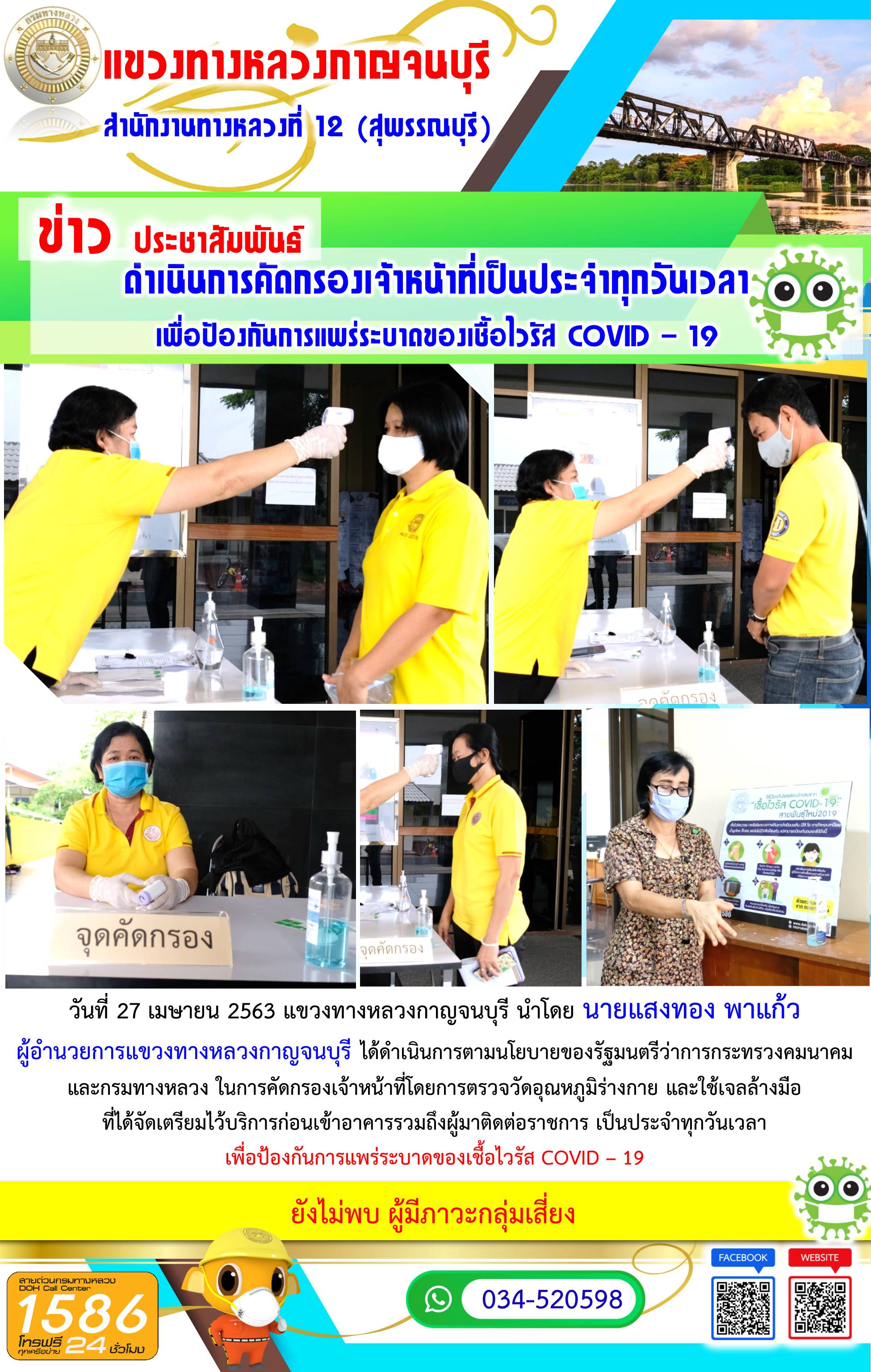 วันที่ 27 เมษายน 2563 แขวงทางหลวงกาญจนบุรี นำโดย นายแสงทอง พาแก้ว ผู้อำนวยการแขวงทางหลวงกาญจนบุรี ได้ดำเนินการตามนโยบายของรัฐมนตรีว่าการกระทรวงคมนาคมและกรมทางหลวง ในการคัดกรองเจ้าหน้าที่โดยการตรวจวัดอุณหภูมิร่างกาย และใช้เจลล้างมือที่ได้จัดเตรียมไว้บริการก่อนเข้าอาคารรวมถึงผู้มาติดต่อราชการ เพื่อป้องกันการแพร่ระบาดของเชื้อไวรัส COVID – 19