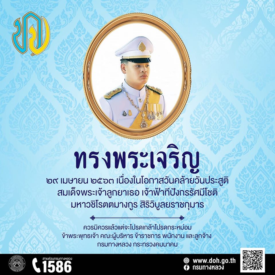 เนื่องในโอกาสวันคล้ายวันประสูติ สมเด็จพระเจ้าลูกยาเธอ เจ้าฟ้าทีปังกรรัศมีโชติ มหาวชิโรตตมางกูร สิริวิบูลยราชกุมาร ทรงเจริญพระชันษา ๑๕ ปี ๒๙ เมษายน ๒๕๖๓ ขอพระองค์ทรงพระเกษมสำราญ พระพลานามัยสมบูรณ์แข็งแรง มีพระชันษายิ่งยืนนาน ควรมิควรแล้วแต่จะโปรดเกล้าโปรดกระหม่อม ข้าพระพุทธเจ้า คณะข้าราชการและเจ้าหน้าที่แขวงทางหลวงกาญจนบุรี กรมทางหลวง กระทรวงคมนาคม