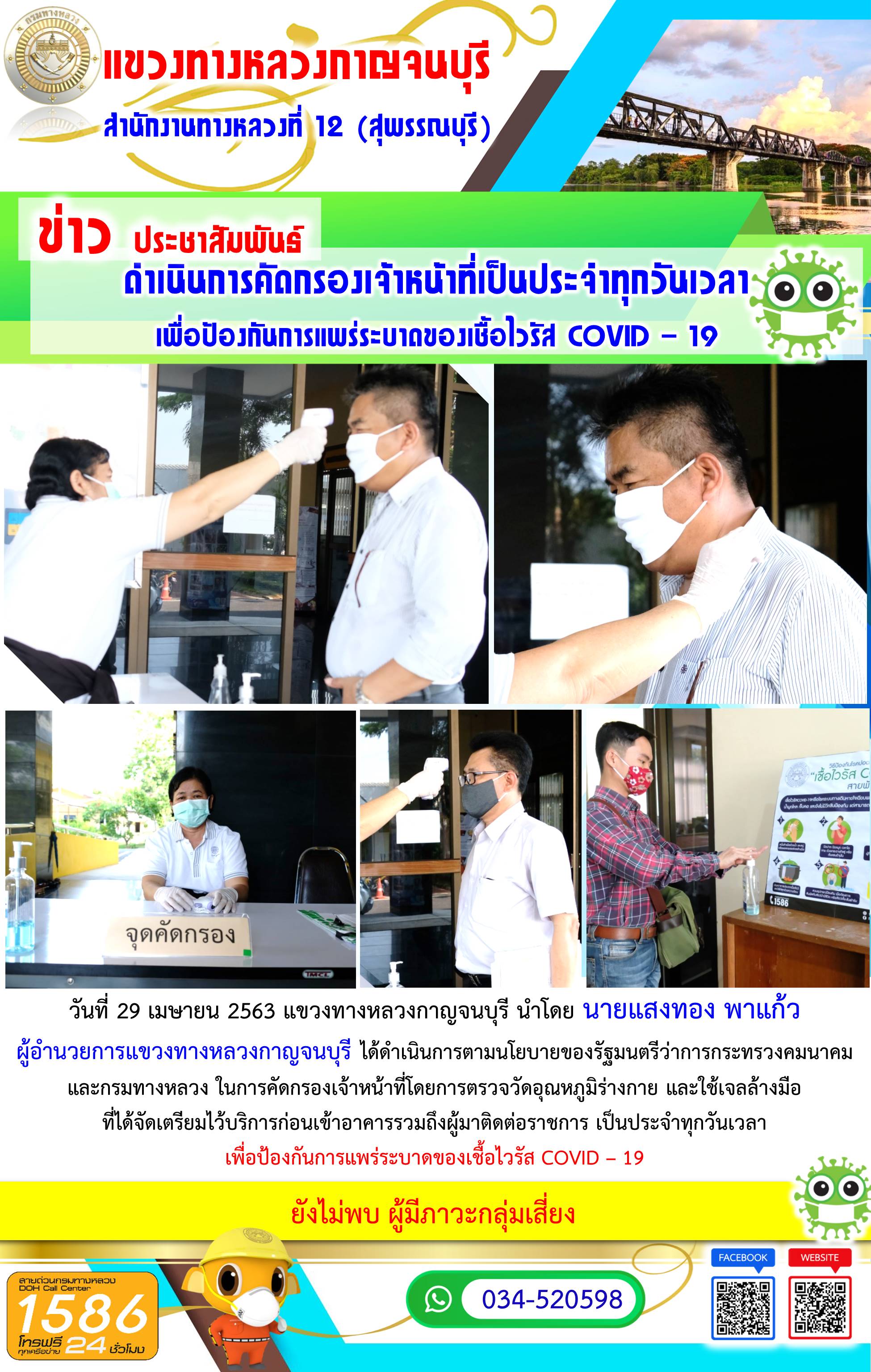 วันที่ 29 เมษายน 2563 แขวงทางหลวงกาญจนบุรี นำโดย นายแสงทอง พาแก้ว ผู้อำนวยการแขวงทางหลวงกาญจนบุรี ได้ดำเนินการตามนโยบายของรัฐมนตรีว่าการกระทรวงคมนาคมและกรมทางหลวง ในการคัดกรองเจ้าหน้าที่โดยการตรวจวัดอุณหภูมิร่างกาย และใช้เจลล้างมือที่ได้จัดเตรียมไว้บริการก่อนเข้าอาคารรวมถึงผู้มาติดต่อราชการ เพื่อป้องกันการแพร่ระบาดของเชื้อไวรัส COVID – 19