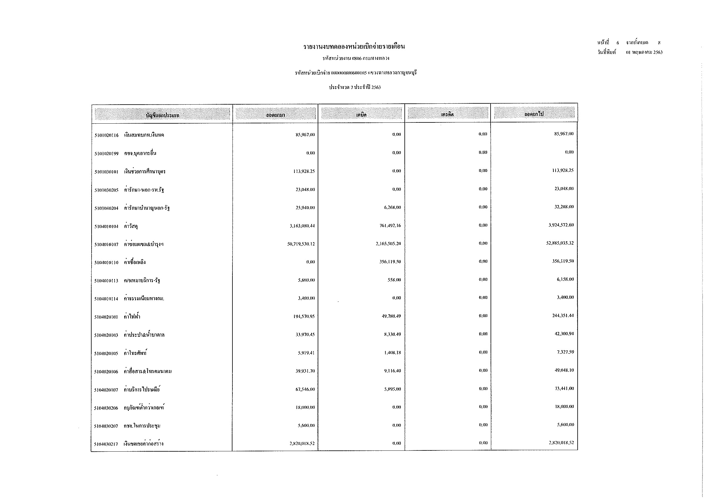 รายงานงบทดลองหน่วยเบิกจ่ายรายเดือน ประจำงวด 6 ประจำปีที่ 2563