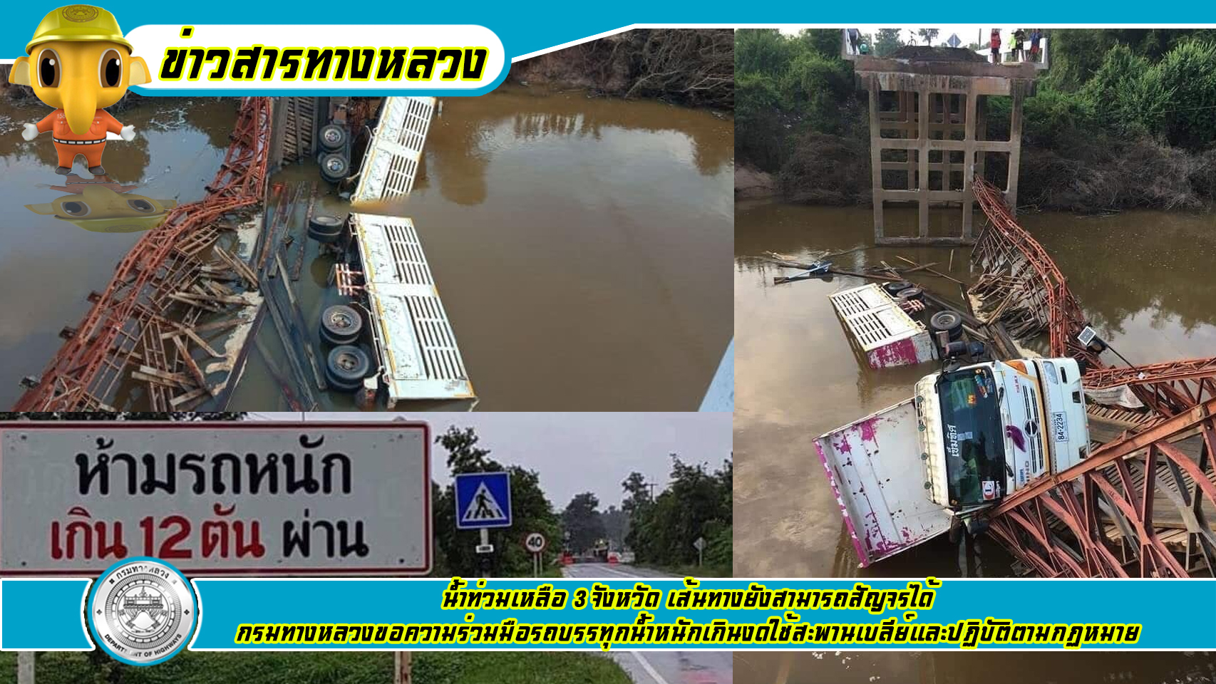 585 18/09/2562 น้ำท่วมเหลือ 3 จังหวัด เส้นทางยังสามารถสัญจรได้ กรมทางหลวงขอความร่วมมือรถบรรทุกน้ำหนักเกินงดใช้สะพานเบลีย์และปฏิบัติตามกฏหมาย