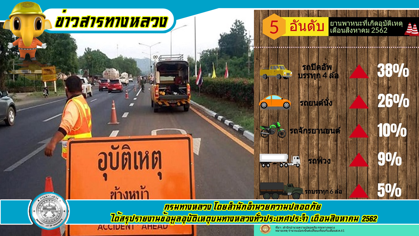 584 19/09/2562 กรมทางหลวง สรุปอุบัติเหตุบนทางหลวงเดือนส.ค. 62 พร้อมขอความร่วมมือปฏิบัติตามกฎจราจร พบอุบัติเหตุแจ้งสายด่วน 1586