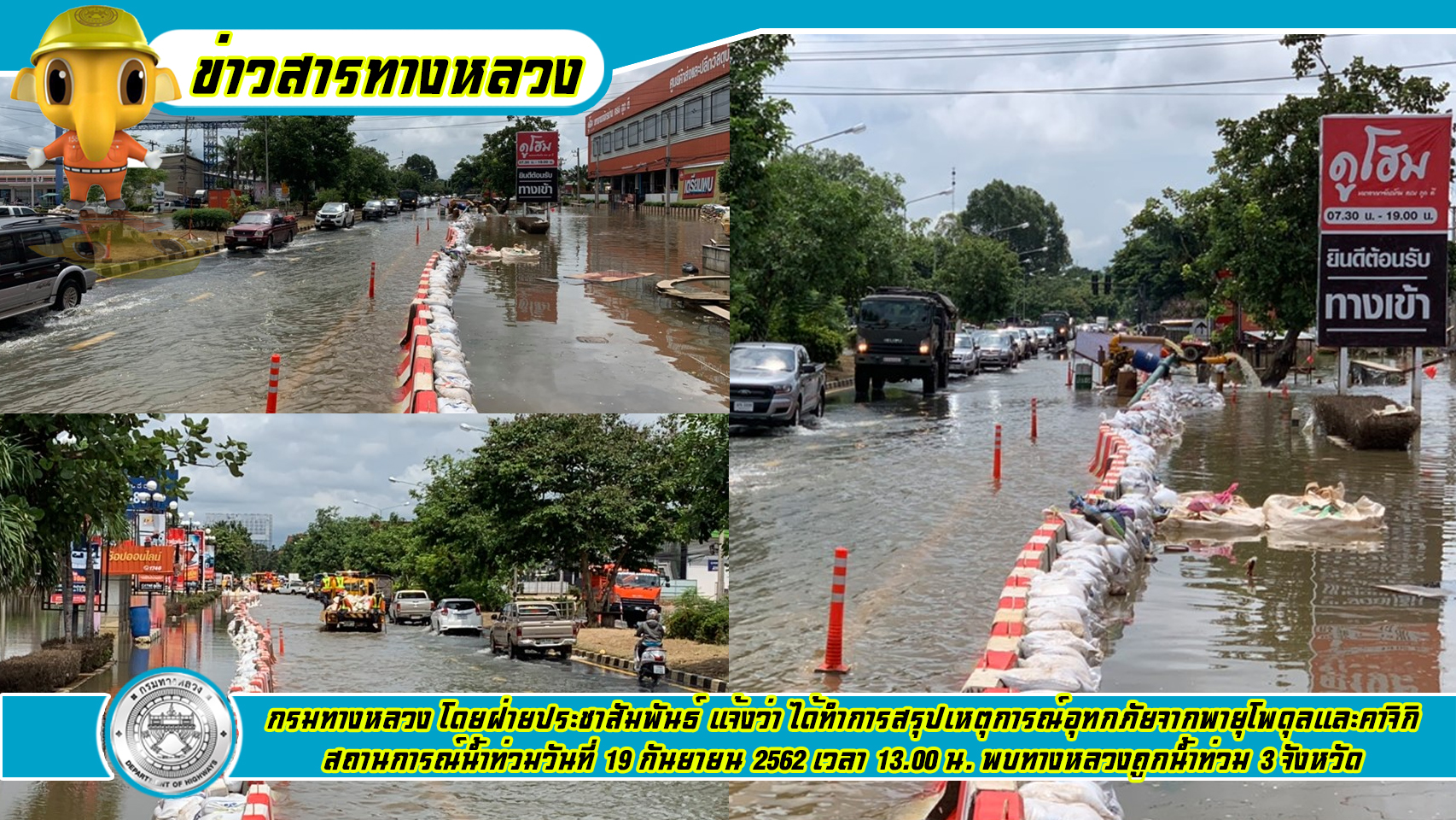 583 20/09/2562 กรมทางหลวง โดยฝ่ายประชาสัมพันธ์ แจ้งว่า ได้ทำการสรุปเหตุการณ์อุทกภัยจากพายุโพดุลและคาจิกิ สถานการณ์น้ำท่วมวันที่ 19 กันยายน 2562 เวลา 13.00 น. พบทางหลวงถูกน้ำท่วม 3 จังหวัด ได้แก่ จังหวัดศรีสะเกษ จังหวัดอุบลราชธานี และจังหวัดอำนาจเจริญ จำนวน 5 สายทาง ทางหลวงที่การจราจรผ่านไม่ได้ 4 แห่ง