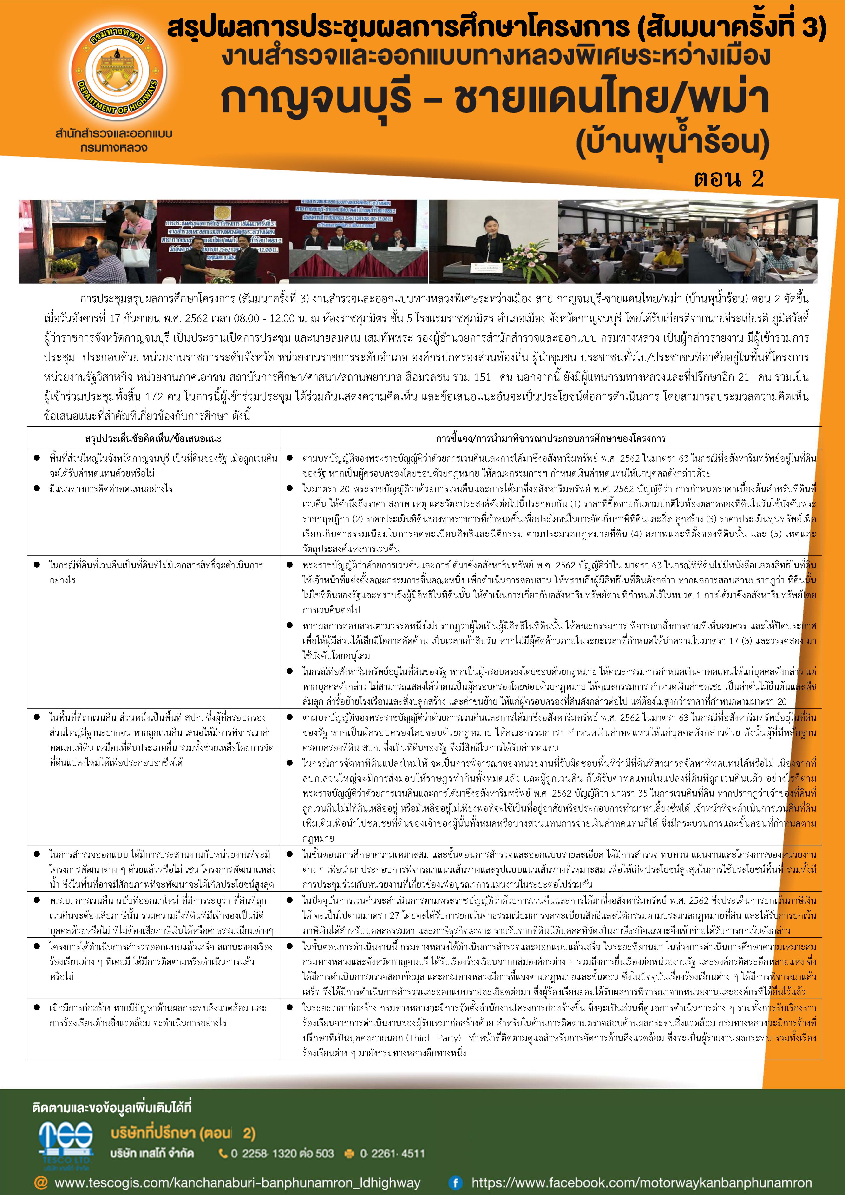 580 04/10/2562 ประชาสัมพันธ์ สรุปผลการประชุมผลการศึกษาโครงการ (สัมนาครั้งที่ 3) งานสำรวจและออกแบบทางหลวงพิเศษระหว่างเมือง กาญจนบุรี - ชายแดนไทย/พม่า(บ้านพุน้ำร้อน)
