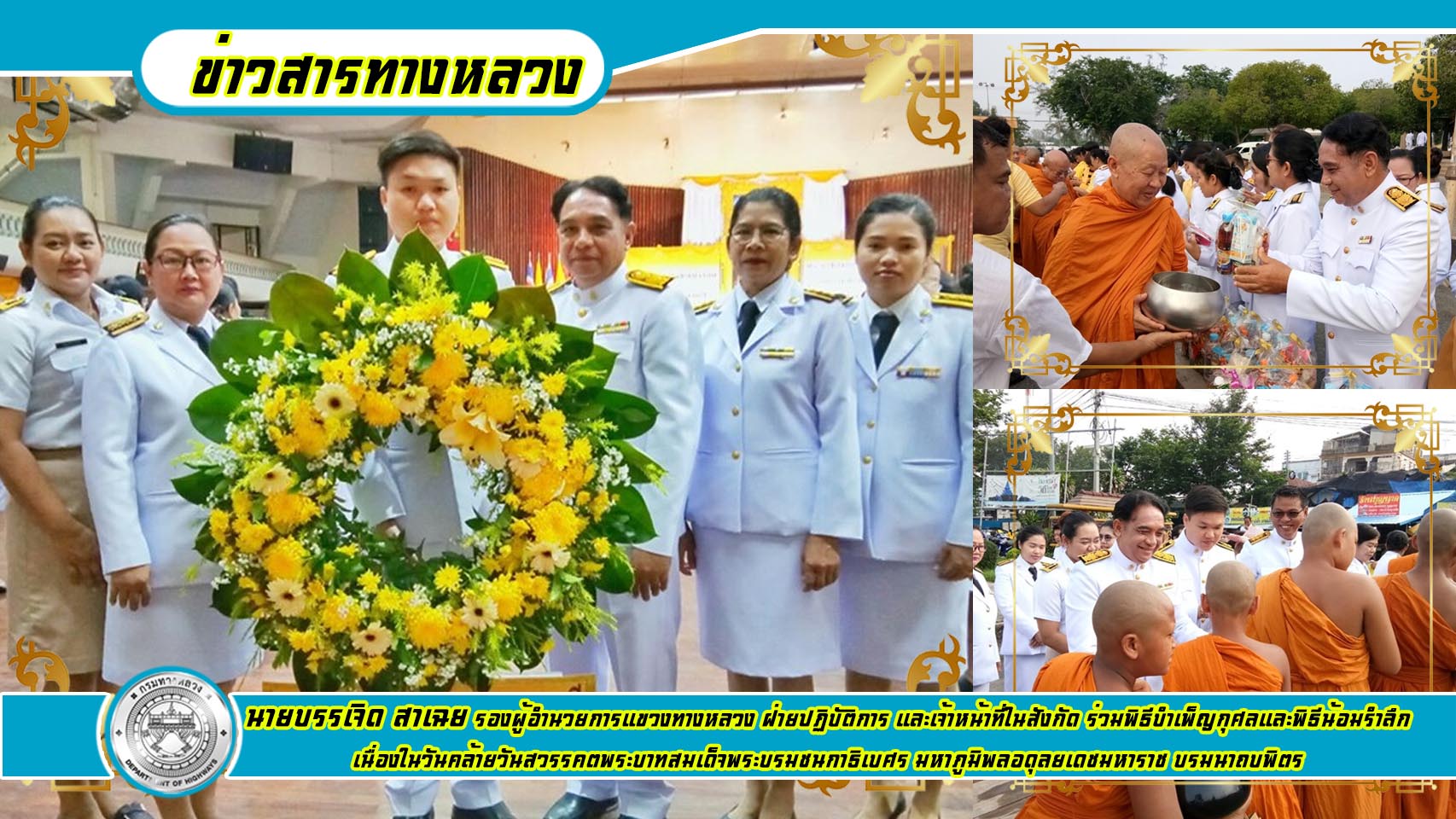 575 13/10/2562 วันที่ ๑๓ ตุลาคม ๒๕๖๒ นายมงคล ทวีชัยทศพล ผู้อำนวยการแขวงทางหลวงกาญจนบุรี มอบหมายให้นายบรรเจิด สาเฉย รองผู้อำนวยการแขวงทางหลวง ฝ่ายปฏิบัติการ และเจ้าหน้าที่ในสังกัด ร่วมพิธีบำเพ็ญกุศลและพิธีน้อมรำลึก เนื่องในวันคล้ายวันสวรรคตพระบาทสมเด็จพระบรมชนกาธิเบศร มหาภูมิพลอดุลยเดชมหาราช บรมนาถบพิตร ณ ศาลา ๖๐ พรรษา จ.กาญจนบุรี