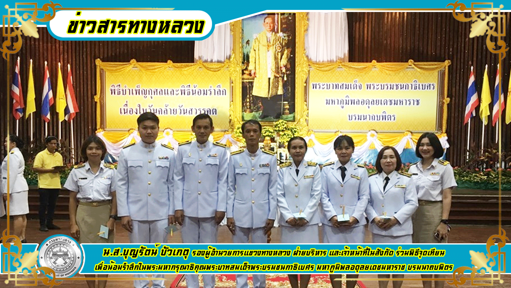 576 15/10/2562 วันที่ ๑๓ ตุลาคม ๒๕๖๒ นายมงคล ทวีชัยทศพล ผู้อำนวยการแขวงทางหลวงกาญจนบุรี มอบหมายให้ น.ส.บุญรัตน์ บัวเกตุ รองผู้อำนวยการแขวงทางหลวง ฝ่ายบริหาร และเจ้าหน้าที่ในสังกัด ร่วมพิธีจุดเทียนเพื่อน้อมรำลึกในพระมหากรุณาธิคุณ พระบาทสมเด็จพระบรมชนกาธิเบศร มหาภูมิพลอดุลยเดชมหาราช บรมนาถบพิตร ณ สนามหน้าศาลกลางจังหวัดกาญจนบุรี