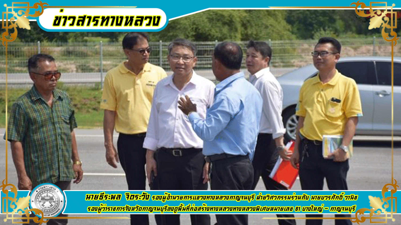 574 16/10/2562 นายธีระพล จิตระวัง รองผู้อำนวยการแขวงทางหลวงกาญจนบุรี ฝ่ายวิศวกรรม ร่วมกับ นายบวรศักดิ์ วานิช รองผู้ว่าราชการจังหวัดกาญจนบุรีและเจ้าหน้าที่ในสังกัด ลงดูพื้นที่ก่อสร้างทางหลวงทางหลวงพิเศษหมายเลข 81 บางใหญ่ - กาญจนบุรี
