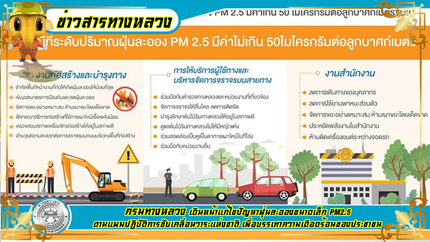 573 20/10/2562 กรมทางหลวง เดินหน้าแก้ไขปัญหาฝุ่นละอองขนาดเล็ก PM2.5 ตามแผนปฏิบัติการขับเคลื่อนวาระแห่งชาติ เพื่อบรรเทาความเดือดร้อนของประชาชน