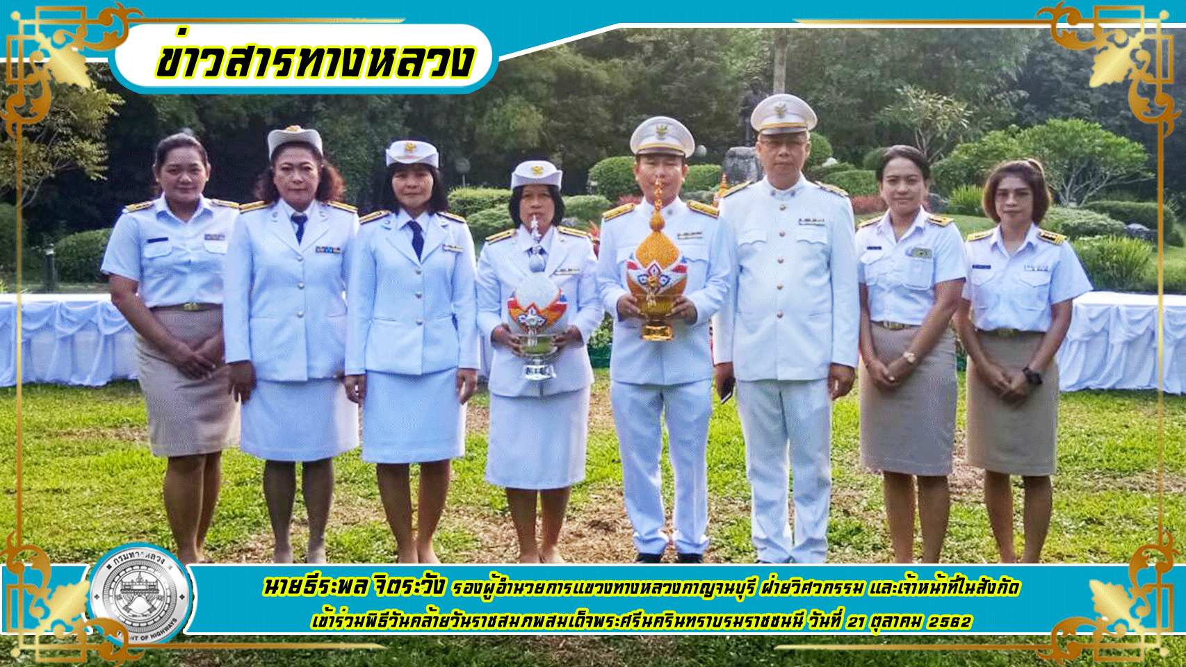 572 21/10/2562 วันที่ ๒๑ ตุลาคม ๒๕๖๒ นายมงคล ทวีชัยทศพล ผู้อำนวยการแขวงทางหลวงกาญจนบุรี มอบหมายให้ นายธีระพล จิตระวัง รองผู้อำนวยการแขวงทางหลวงกาญจนบุรี ฝ่ายวิศวกรรม และเจ้าหน้าที่ในสังกัด เข้าร่วมพิธีสักการะ เนื่องในวันคล้ายวันพระราชสมภพของสมเด็จพระศรีนครินทราบรมราชชนนี ณ บริเวณพระราชานุสารรีย์ สมเด็จพระศรีนครินทราบรมราชชนนี สวนสมเด็จพระศรีนครินทร์กาญจนบุรี วิทยาลัยเกษตรและเทคโนโลยีกาญจนบุรี อำเภอเมือง จังหวัดกาญจนบุรี