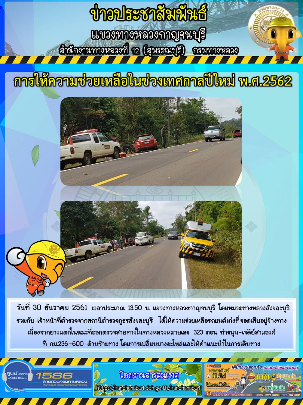 702 30/12/2561 แขวงทางหลวงกาญจนบุรี โดยหมวดทางหลวงสังขละบุรีร่วมกับ เจ้าหน้าที่ตำรวจจากสถานีตำรวจภูธรสังขละบุรี ได้ให้ความช่วยเหลือรถยนต์เก๋งที่จอดเสียอยู่ข้างทาง เนื่องจากยางแตกในขณะที่ออกตรวจสายทางในทางหลวงหมายเลข 323 30/12/61