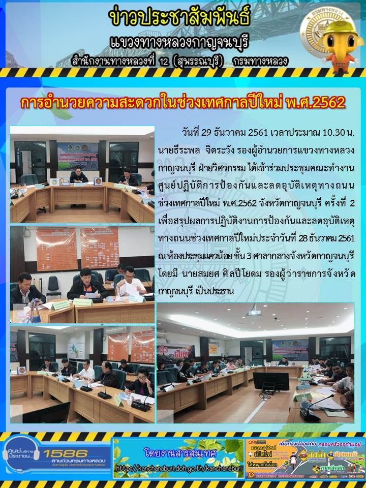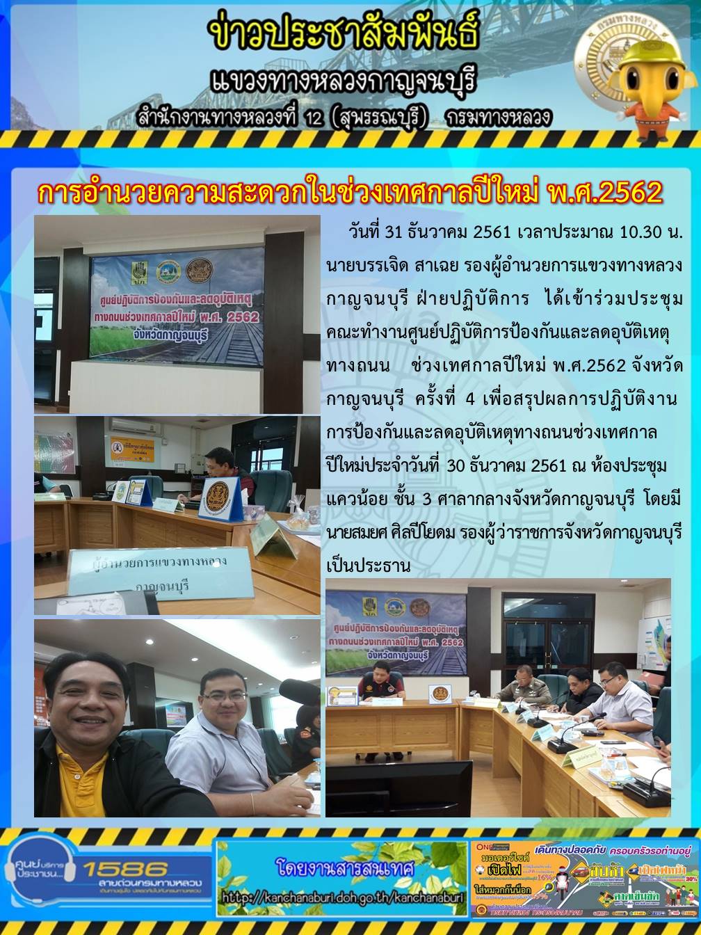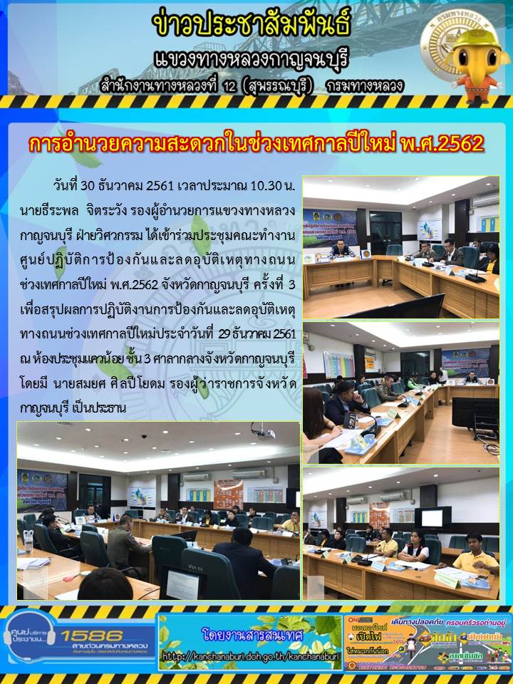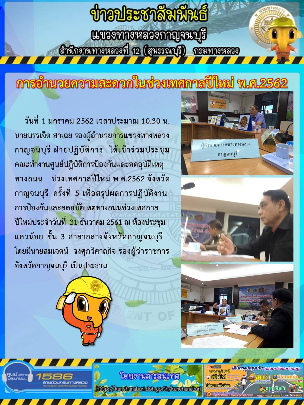 698 30/12/2561 นายธีรพล จิตระวัง รองผู้อำนวยการแขวงทางหลวงกาญจนบุรี ฝ่ายวิศวกรรม ได้เข้าร่วมประชุมคณะทำงานศูนย์ปฏิบัติการป้องกันและลดอุบัติเหตุทางถนน ช่วงเทศกาลปีใหม่ พ.ศ.2562 30/12/61
