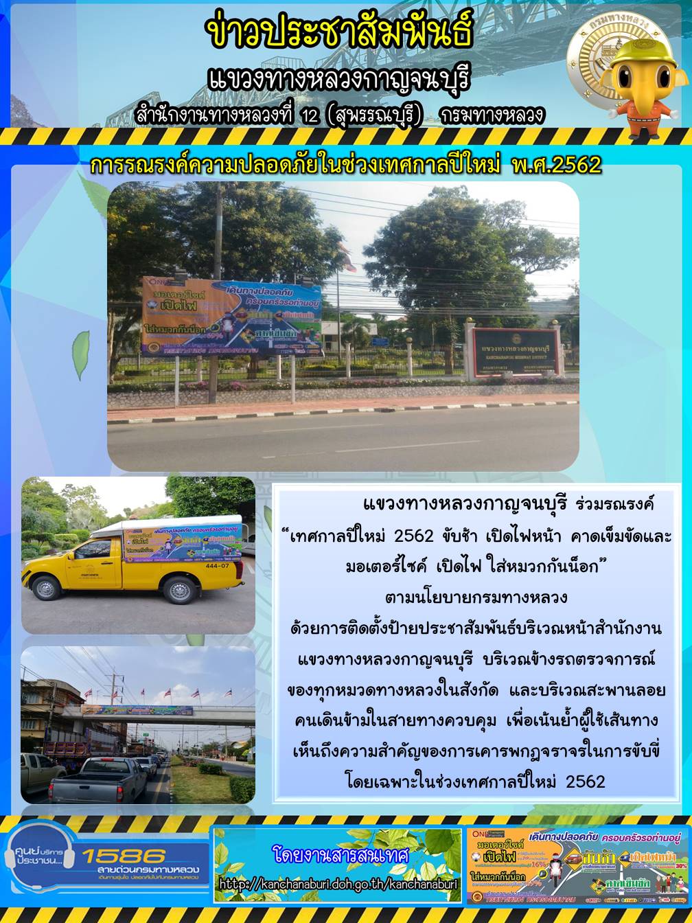 721 24/12/2561 แขวงทางหลวงกาญจนบุรี ร่วมรณรงค์ “เทศกาลปีใหม่ 2562 ขับช้า เปิดไฟหน้า คาดเข็มขัดและมอเตอร์ไซค์ เปิดไฟ ใส่หมวกกันน็อก”