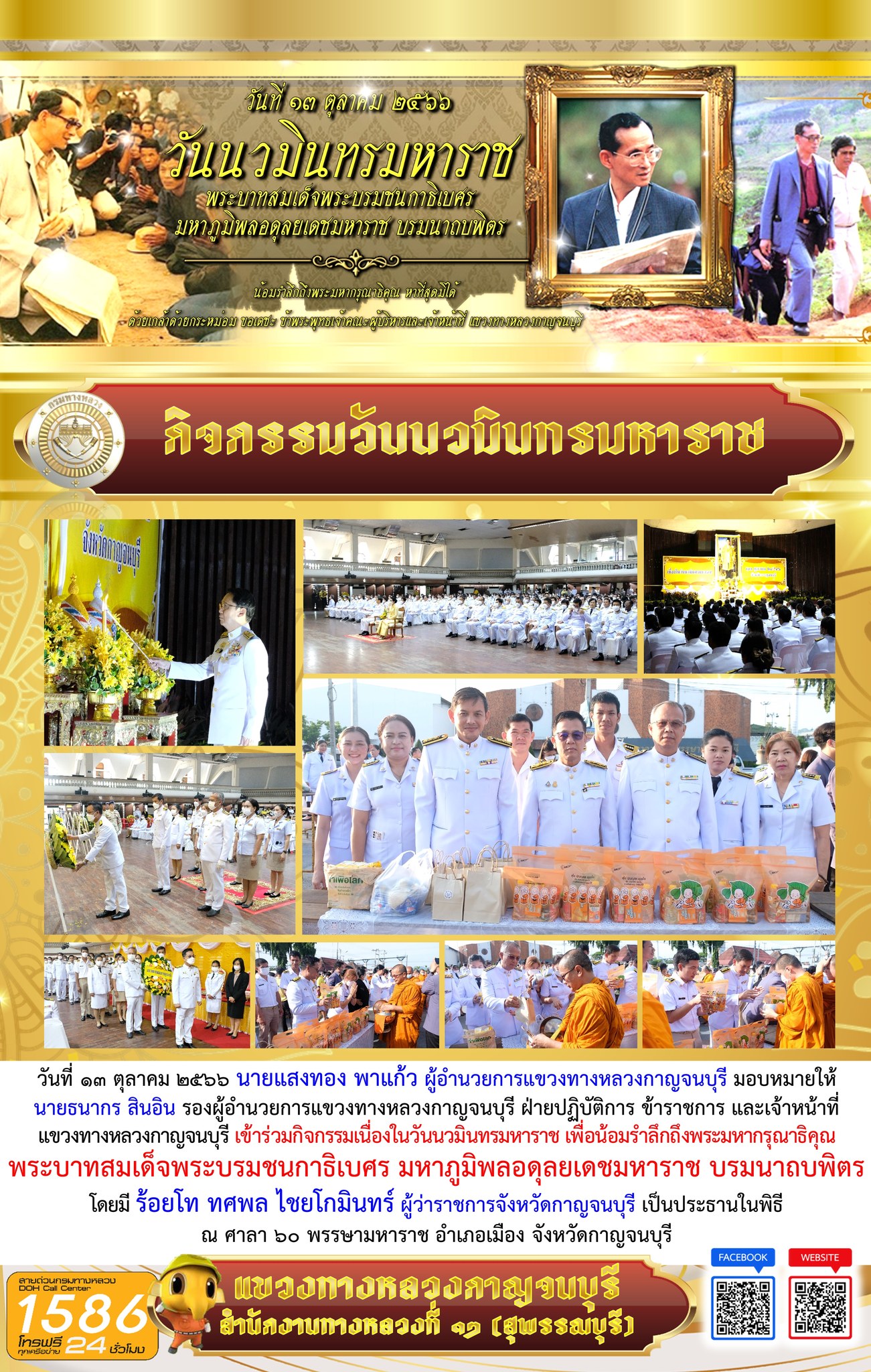 วันที่ ๑๓ ตุลาคม ๒๕๖๖ นายแสงทอง พาแก้ว ผู้อำนวยการแขวงทางหลวงกาญจนบุรี มอบหมายให้ นายธนากร สินอิน รองผู้อำนวยการแขวงทางหลวงกาญจนบุรี ฝ่ายปฏิบัติการ ข้าราชการ และเจ้าหน้าที่แขวงทางหลวงกาญจนบุรี เข้าร่วมกิจกรรมเนื่องในวันนวมินทรมหาราช เพื่อน้อมรำลึกถึงพระมหากรุณาธิคุณ