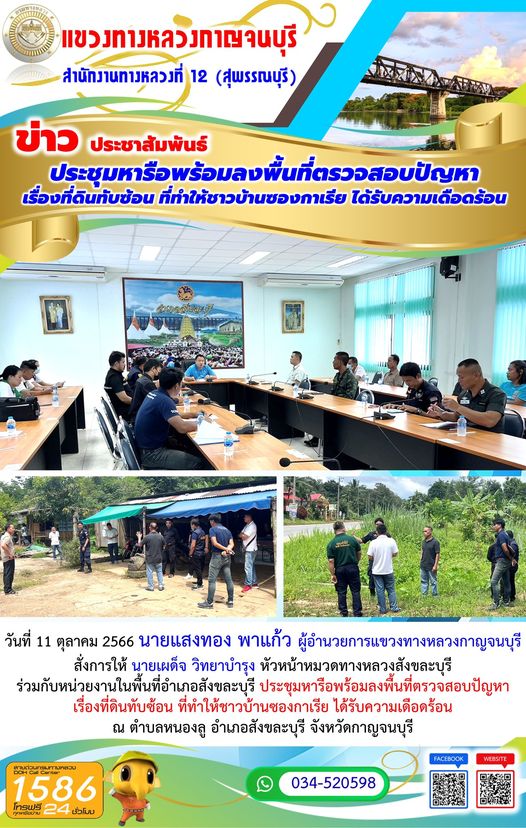 วันที่ 11 ตุลาคม 2566 นายแสงทอง พาแก้ว ผู้อำนวยการแขวงทางหลวงกาญจนบุรี สั่งการให้ นายเผด็จ วิทยาบำรุง หัวหน้าหมวดทางหลวงสังขละบุรี ร่วมกับหน่วยงานในพื้นที่อำเภอสังขละบุรี ประชุมหารือพร้อมลงพื้นที่ตรวจสอบปัญหา เรื่องที่ดินทับซ้อน ที่ทำให้ชาวบ้านซองกาเรีย ได้รับความเดือดร้อน ณ ตำบลหนองลู อำเภอสังขละบุรี จังหวัดกาญจนบุรี
