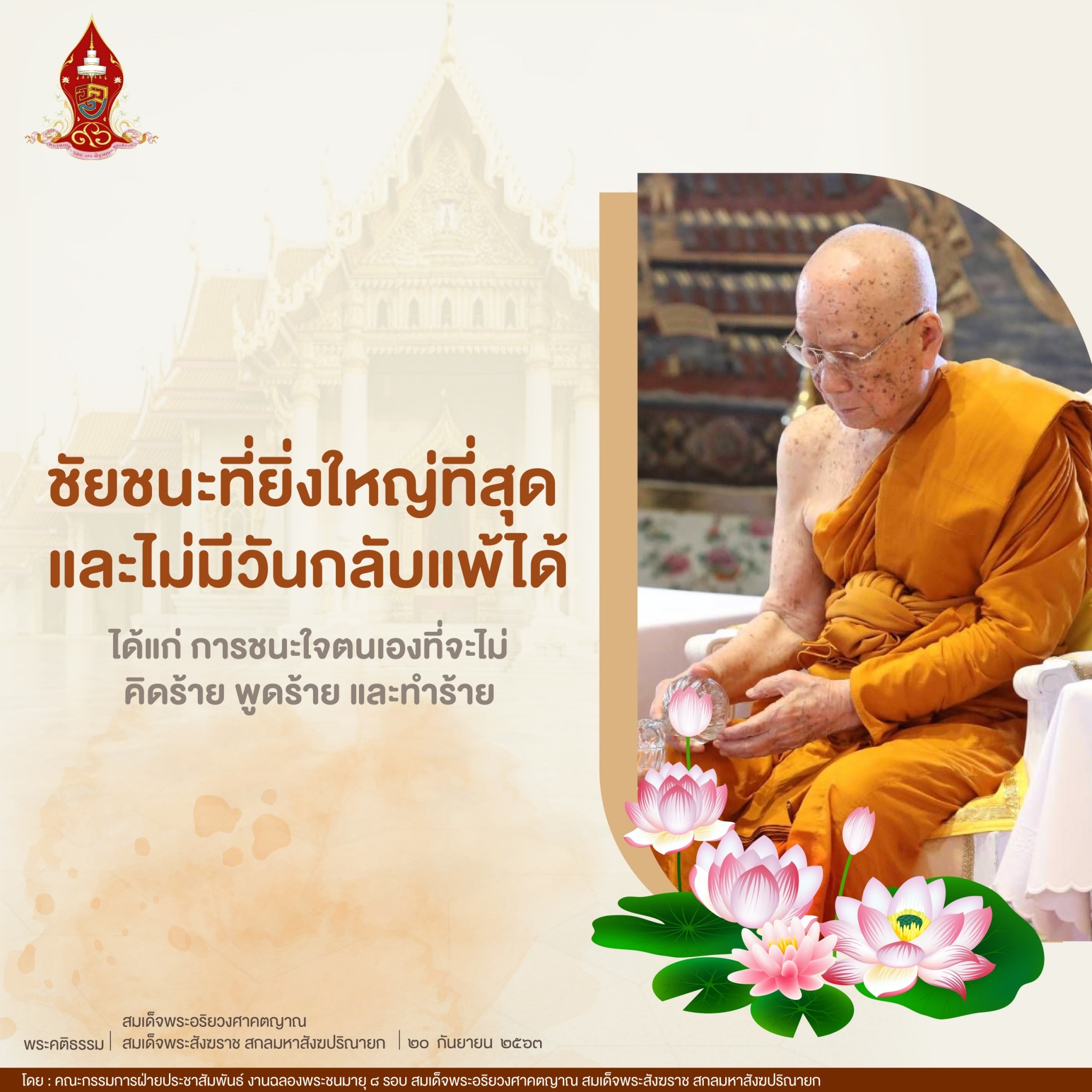 ชัยชนะที่ยิ่งใหญ่ที่สุดและไม่มีวันกลับแพ้ได้ ได้แก่ การชนะใจตนเองที่จะไม่คิดร้าย พูดร้าย และทำร้าย หากพิจารณาพฤติการณ์ทั่วไปในหมู่มนุษย์ย่อมพบว่า การได้ชัยชนะบางทีก็มิใช่ความสุข หากเราไม่รู้จักเอาชนะใจของตนเองให้ได้ก่อน คนที่เอาชนะใจตนได้ ย่อมได้รับความสุขอันแท้จริง