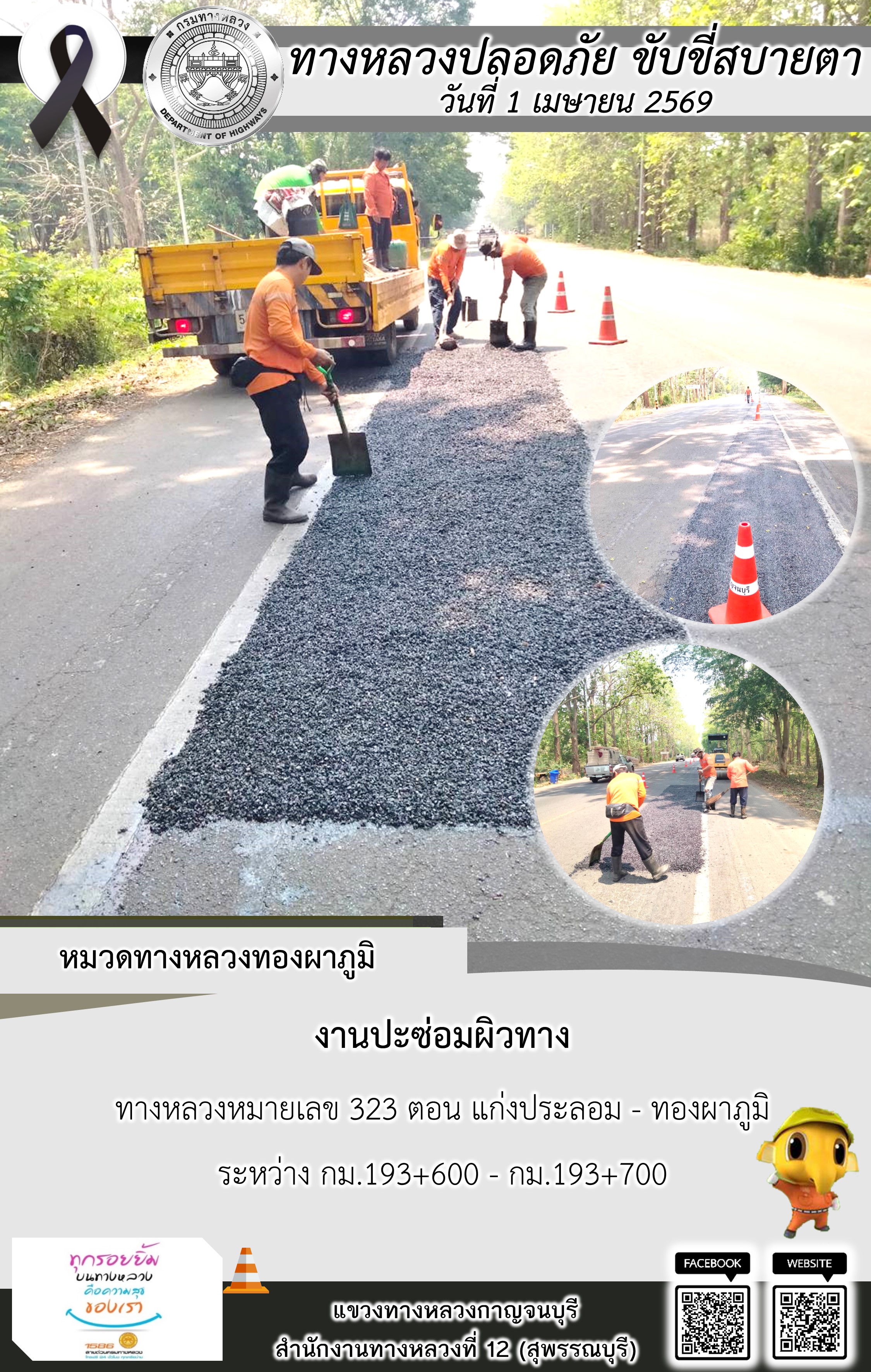 ข้อมูลภาพกิจกรรม : แขวงทางหลวงกาญจนบุรี โดยหมวดทางหลวงในสังกัด และงานอำนวยความปลอดภัยปฏิบัติงาน ประจำวันที่ 1 เม.ย. 69