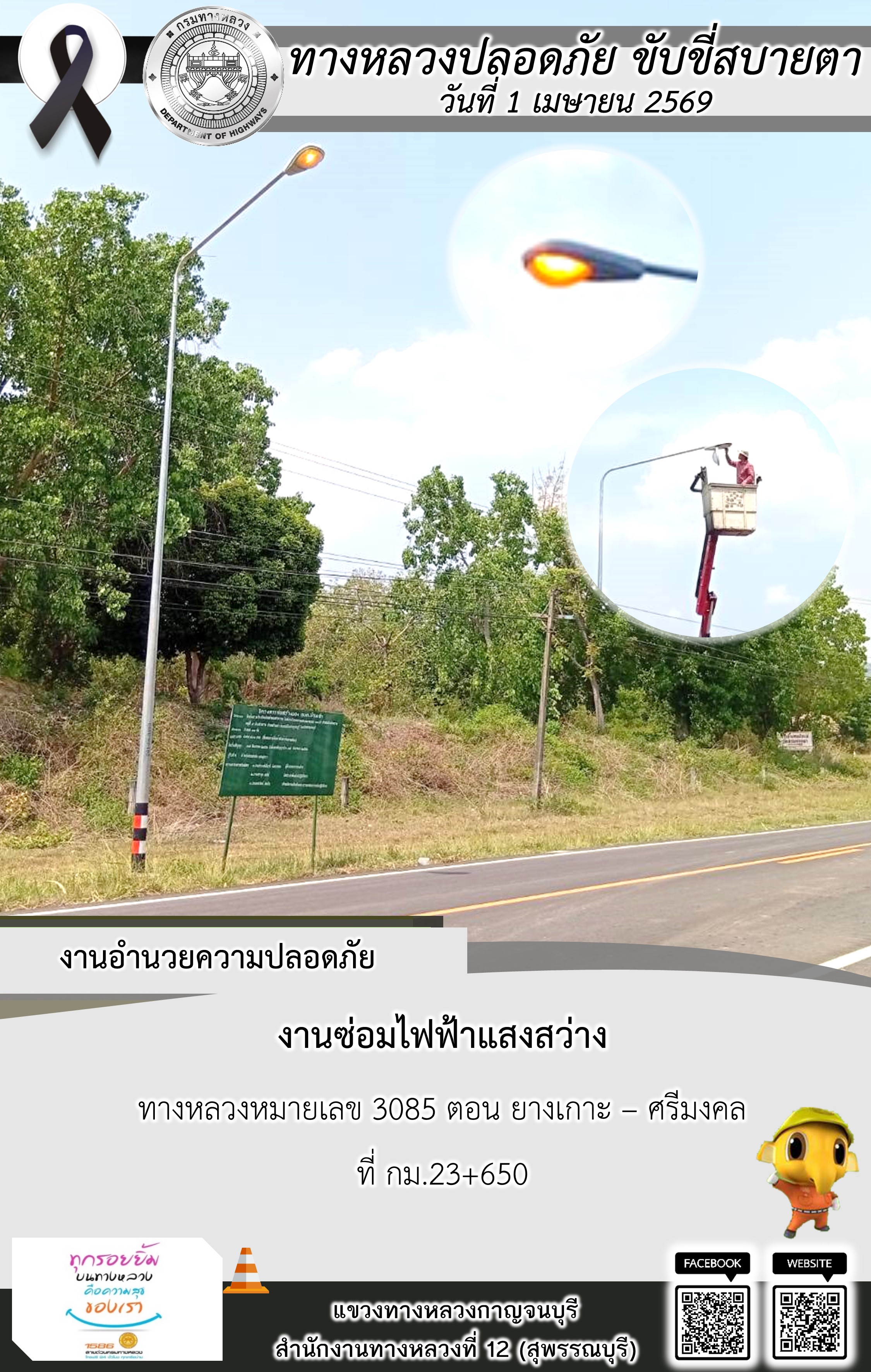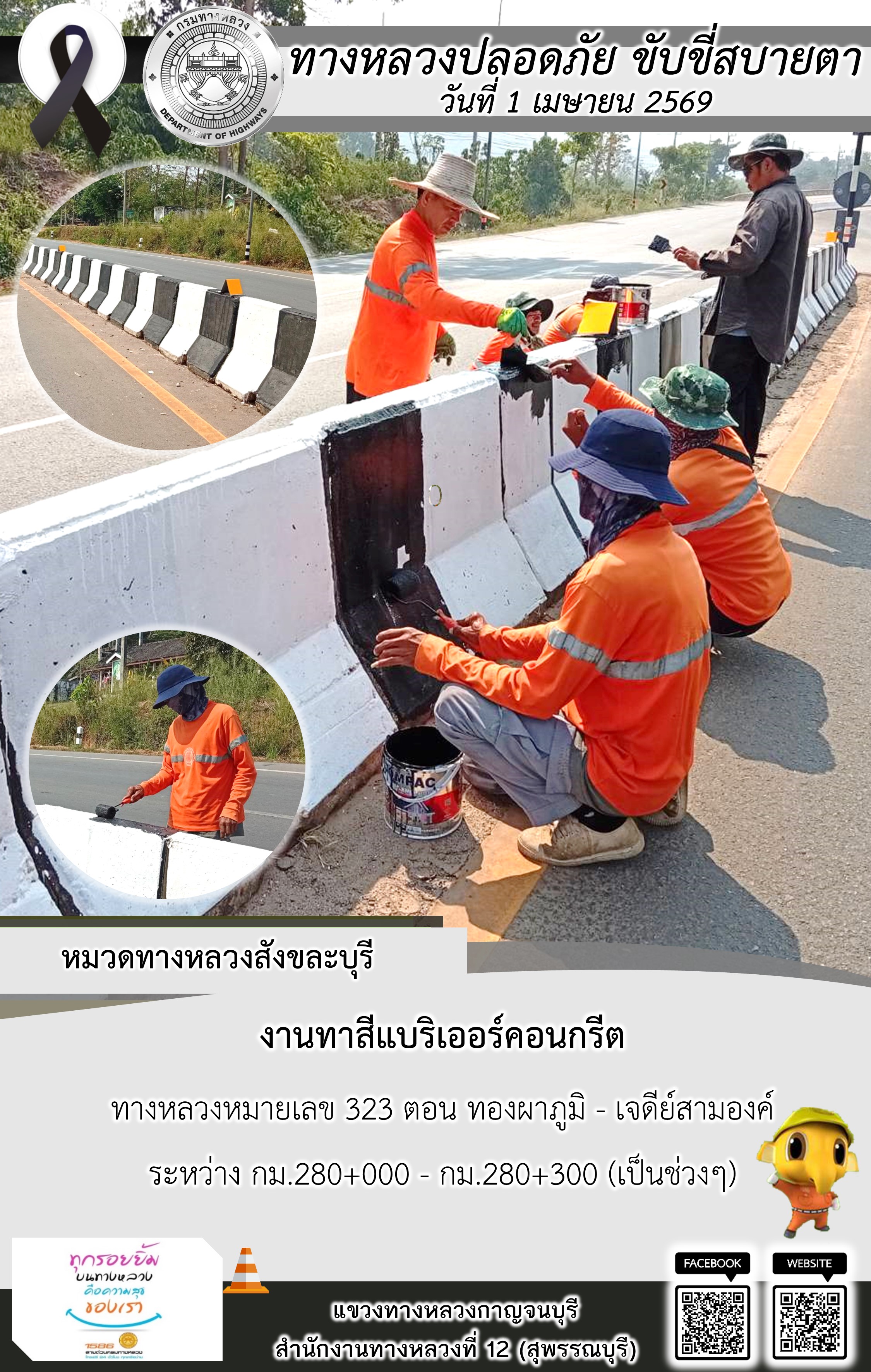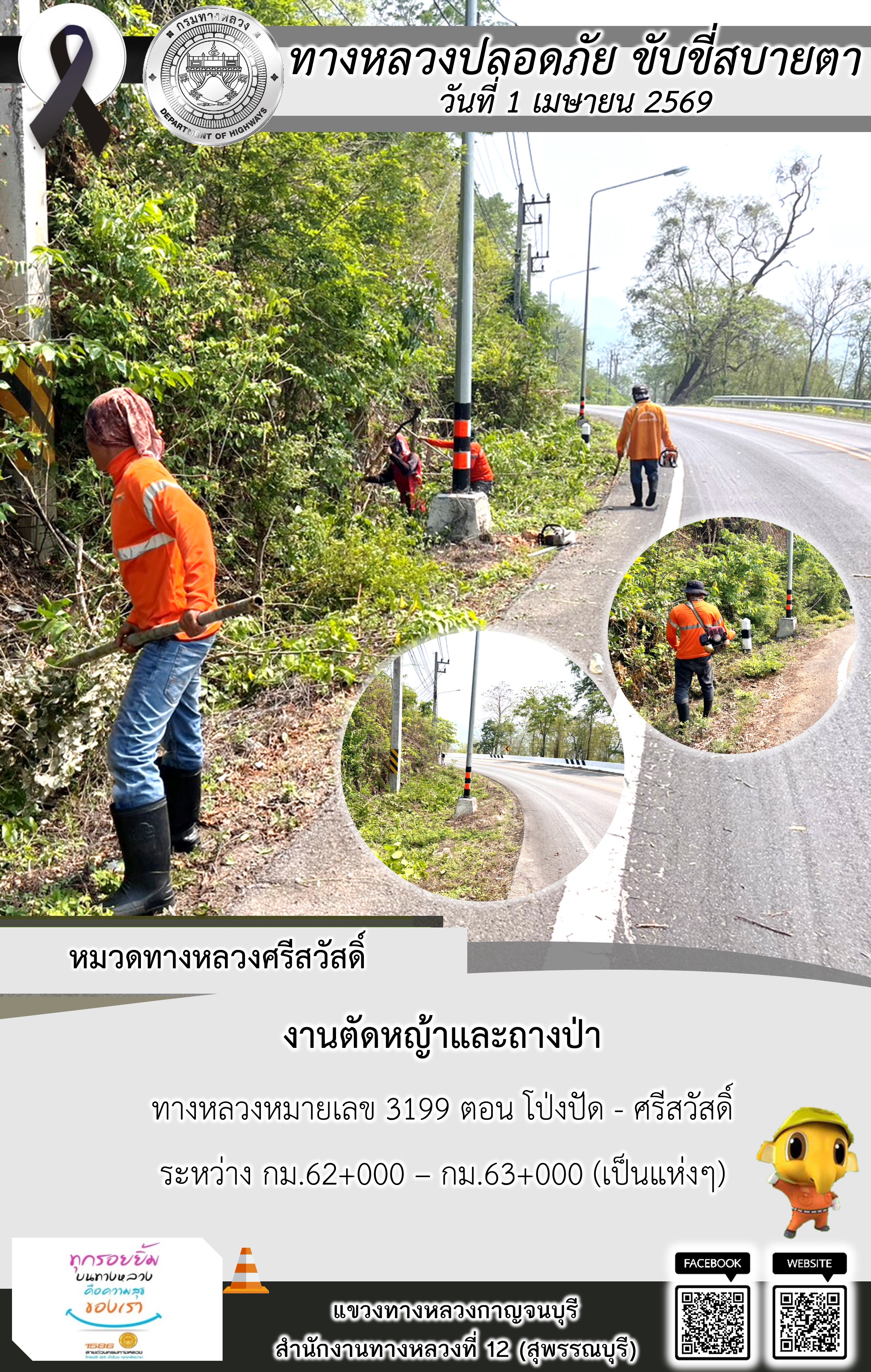 แขวงทางหลวงกาญจนบุรี โดยหมวดทางหลวงในสังกัด และงานอำนวยความปลอดภัยปฏิบัติงาน ประจำวันที่ 1 เม.ย. 69