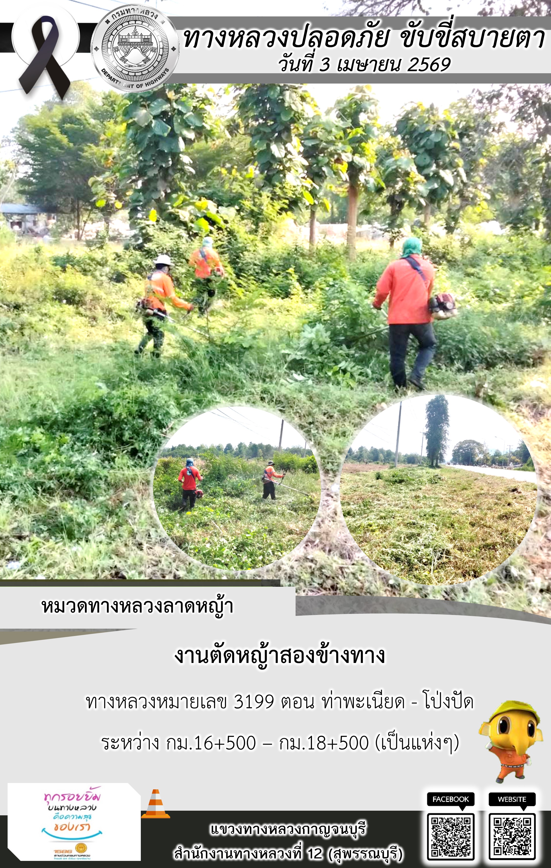 ข้อมูลภาพกิจกรรม : แขวงทางหลวงกาญจนบุรี โดยหมวดทางหลวงในสังกัด และงานอำนวยความปลอดภัยปฏิบัติงาน ประจำวันที่ 3 เม.ย. 69