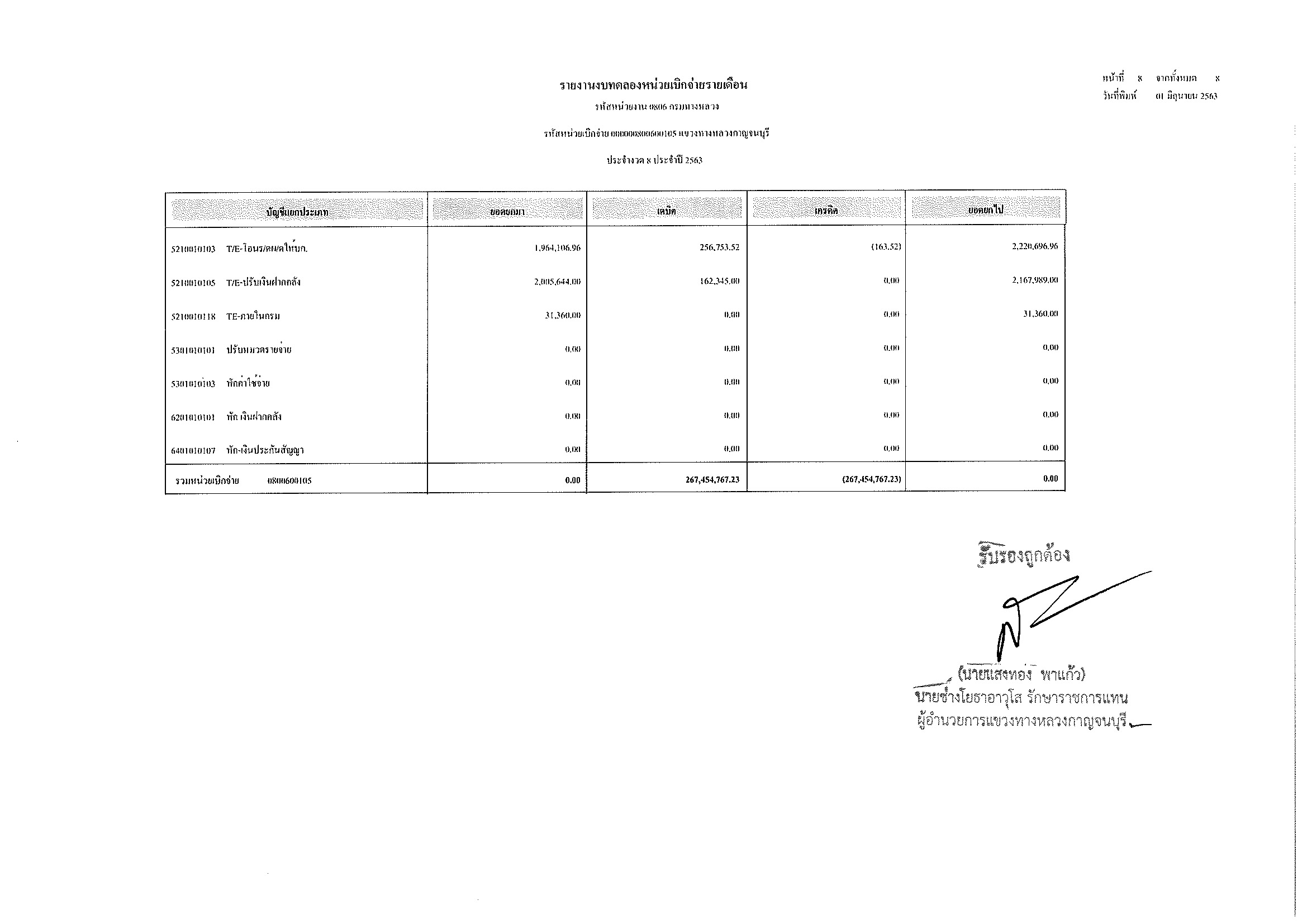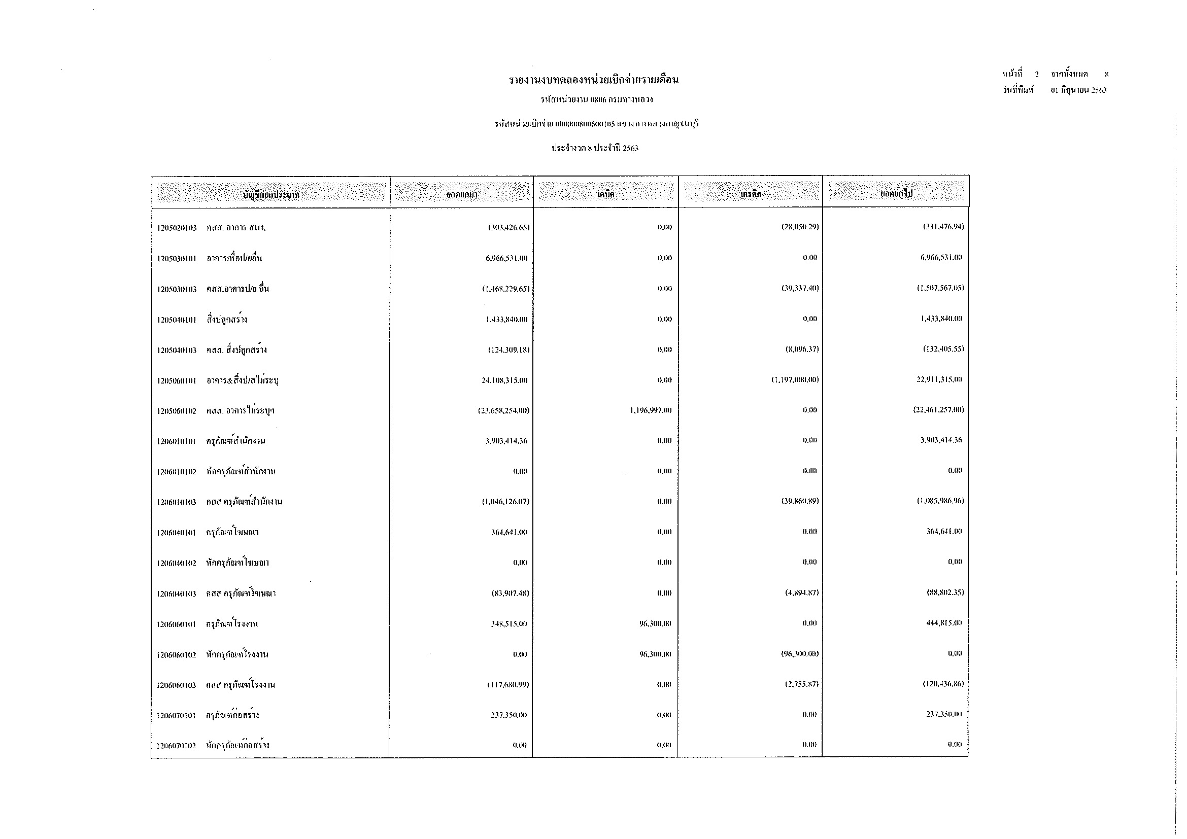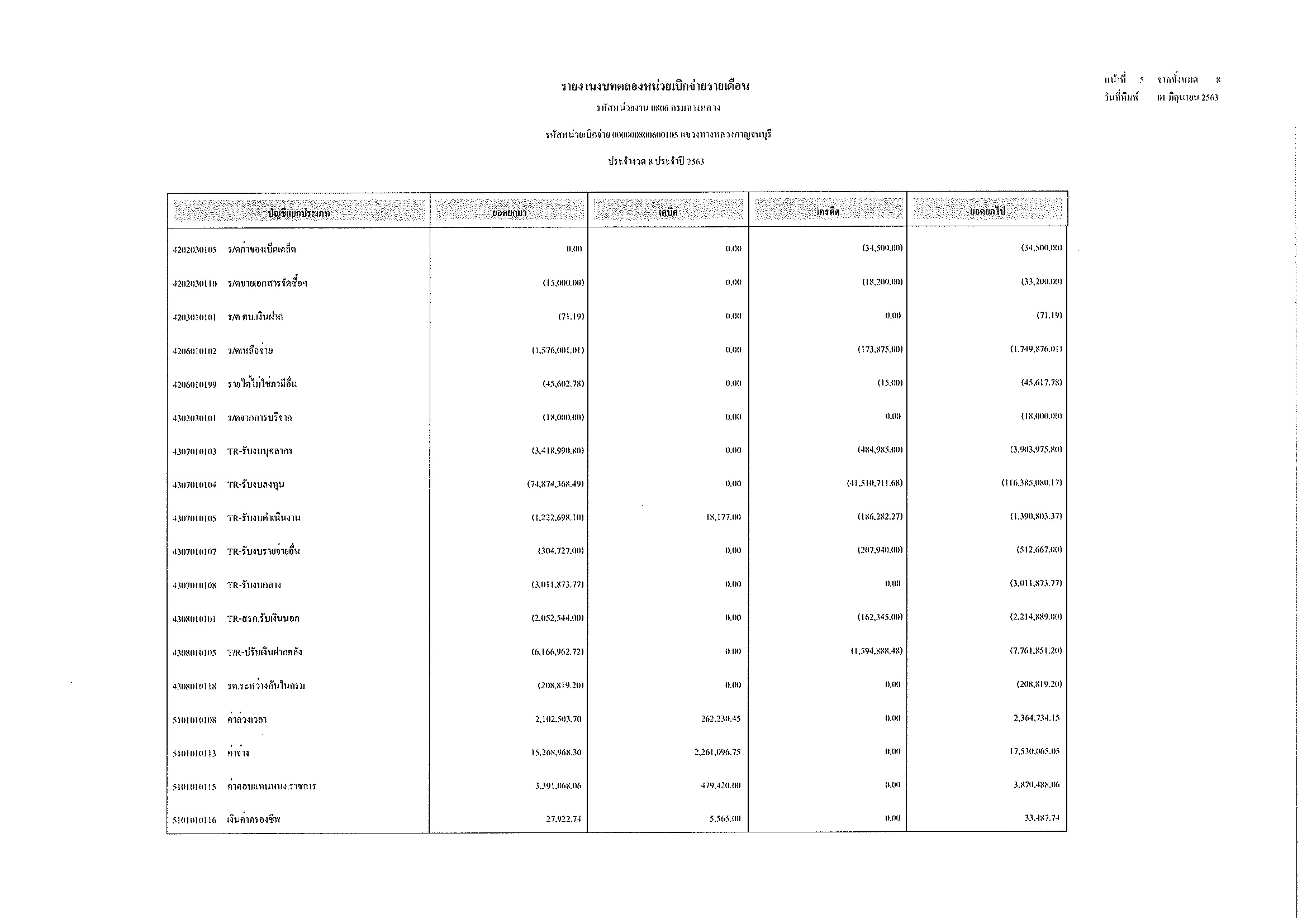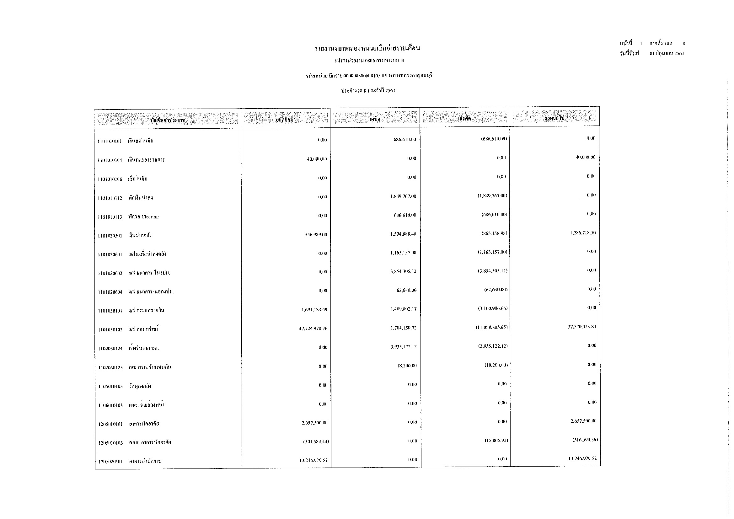 รายงานงบทดลองหน่วยเบิกจ่ายรายเดือน ประจำงวด 8 ประจำปีที่ 2563