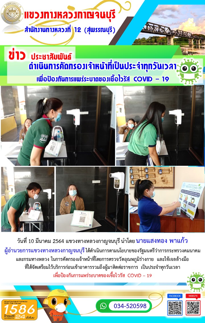 วันที่ 10 มีนาคม 2564 แขวงทางหลวงกาญจนบุรี นำโดย นายแสงทอง พาแก้ว ผู้อำนวยการแขวงทางหลวงกาญจนบุรี ได้ดำเนินการตามนโยบายของรัฐมนตรีว่าการกระทรวงคมนาคมและกรมทางหลวง ในการคัดกรองเจ้าหน้าที่โดยการตรวจวัดอุณหภูมิร่างกาย และใช้เจลล้างมือที่ได้จัดเตรียมไว้บริการก่อนเข้าอาคารรวมถึงผู้มาติดต่อราชการ เพื่อป้องกันการแพร่ระบาดของเชื้อไวรัส COVID – 19
