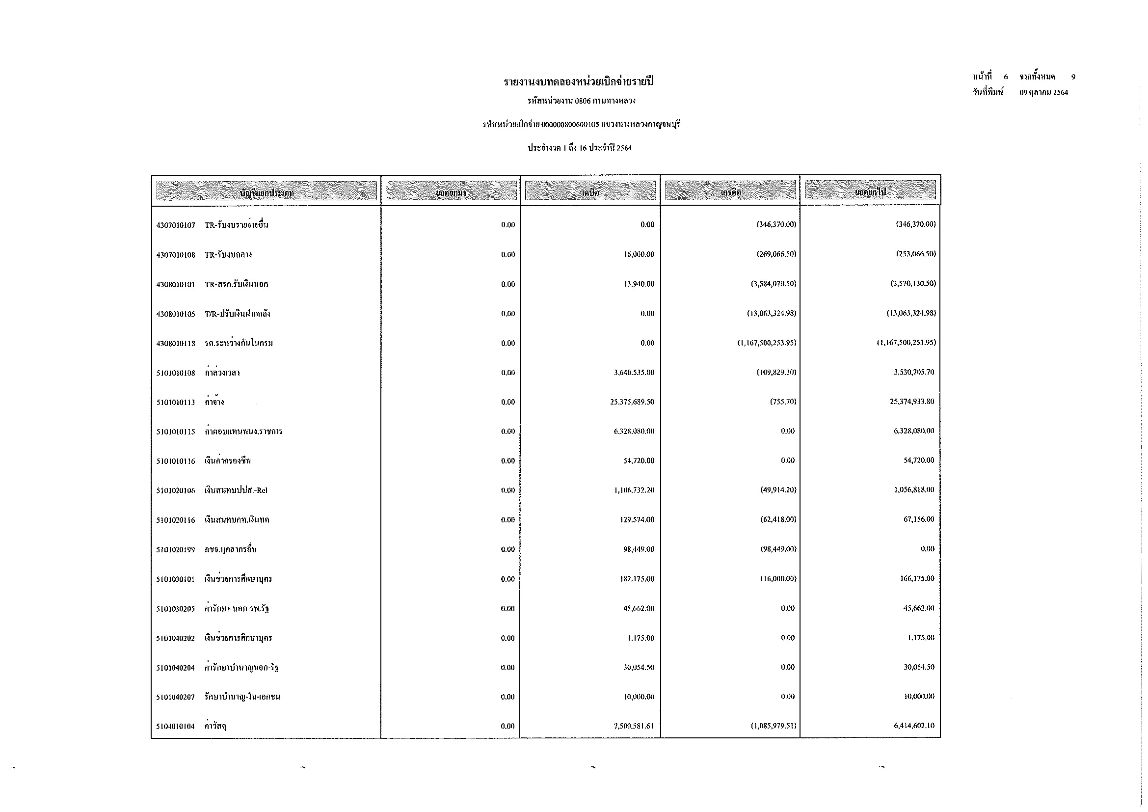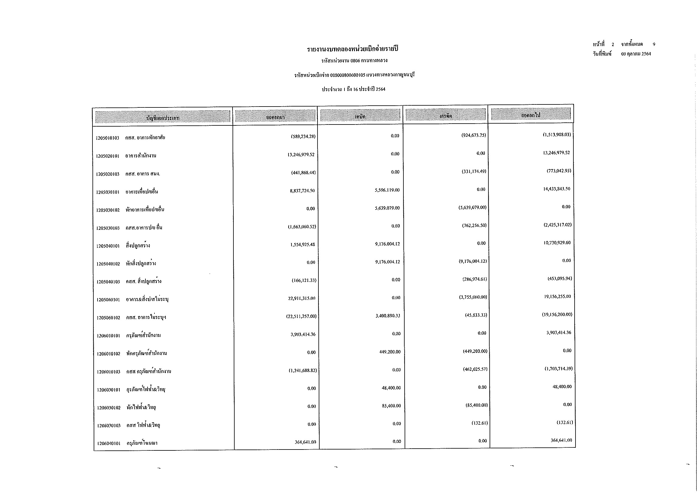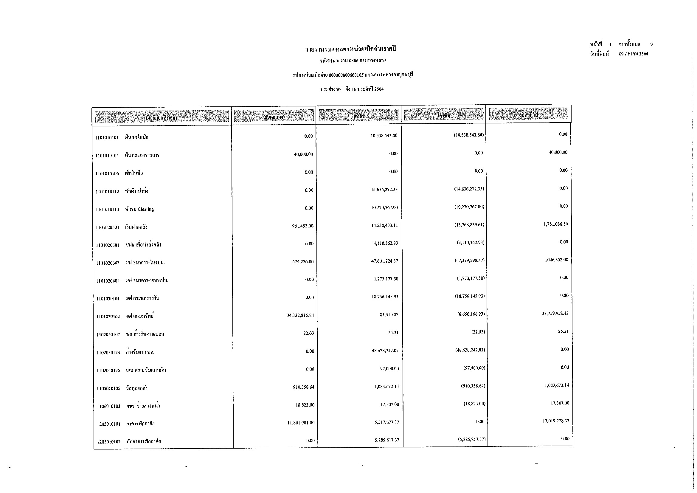 รายงานงบทดลองหน่วยเบิกจ่ายรายปี ประจำงวด 1 ถึง 16 ประจำปีที่ 2564 และ รายละเอียดประกอบรายการบัญชีที่สำคัญของงบทดลอง กรมทางหลวง แขวงทางหลวงกาญจนบุรี ณวันที่ 30 กันยายน 2564