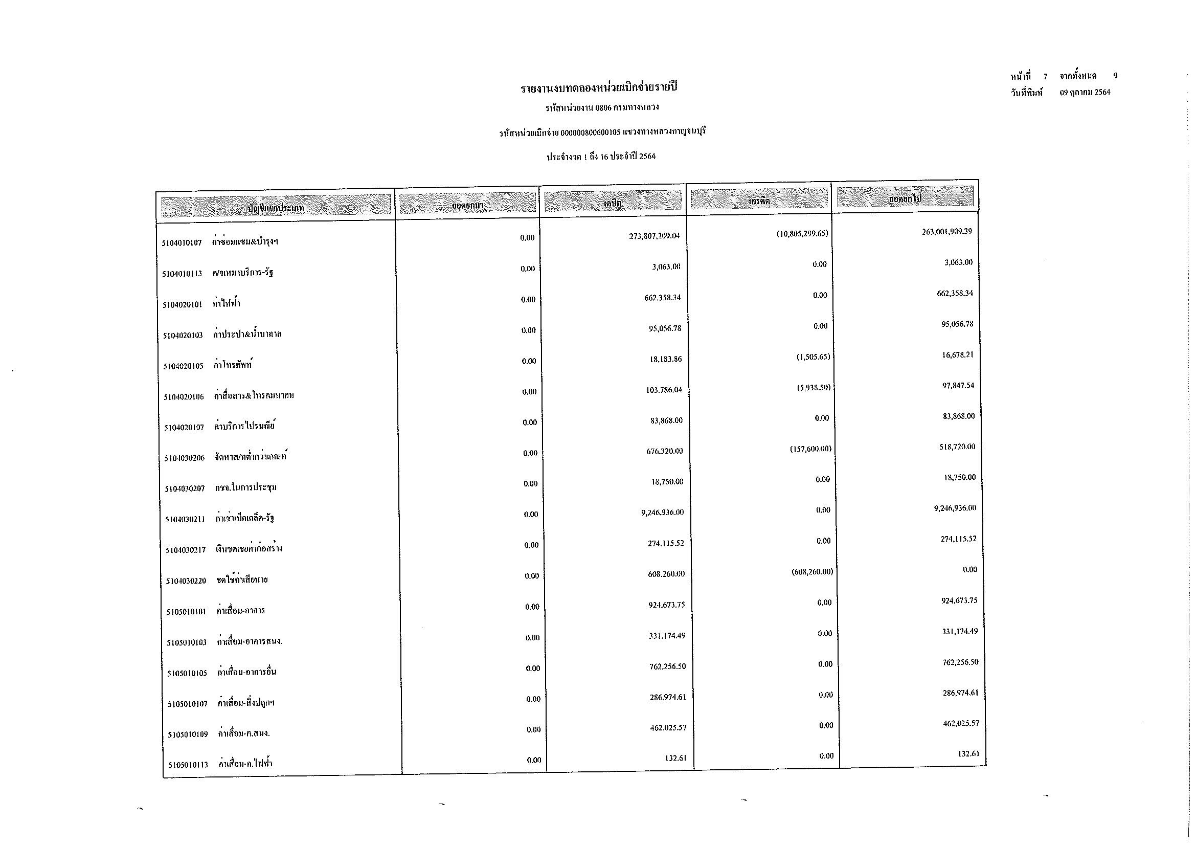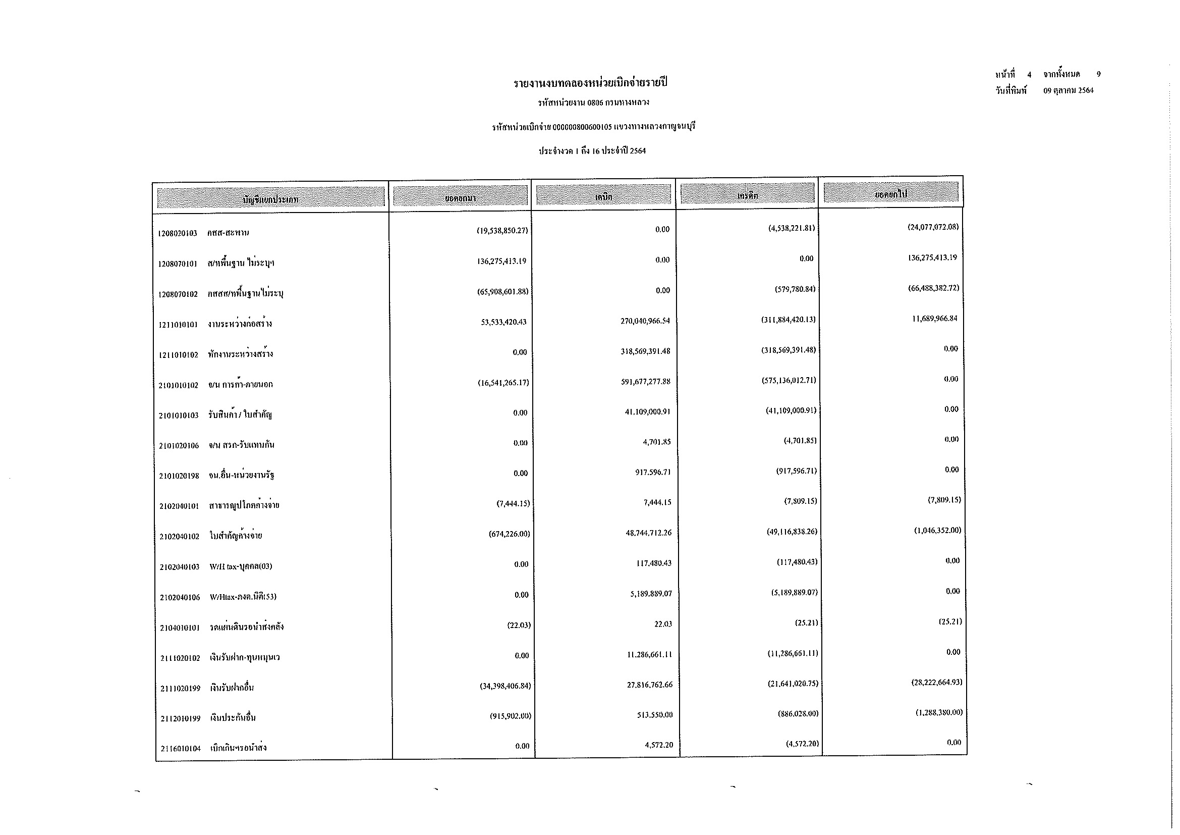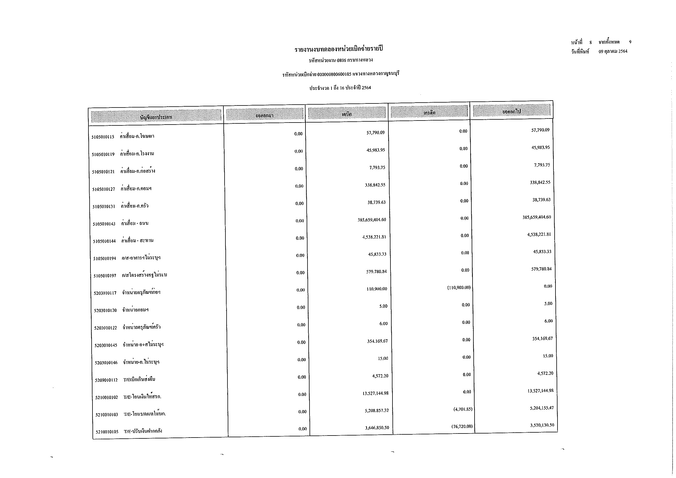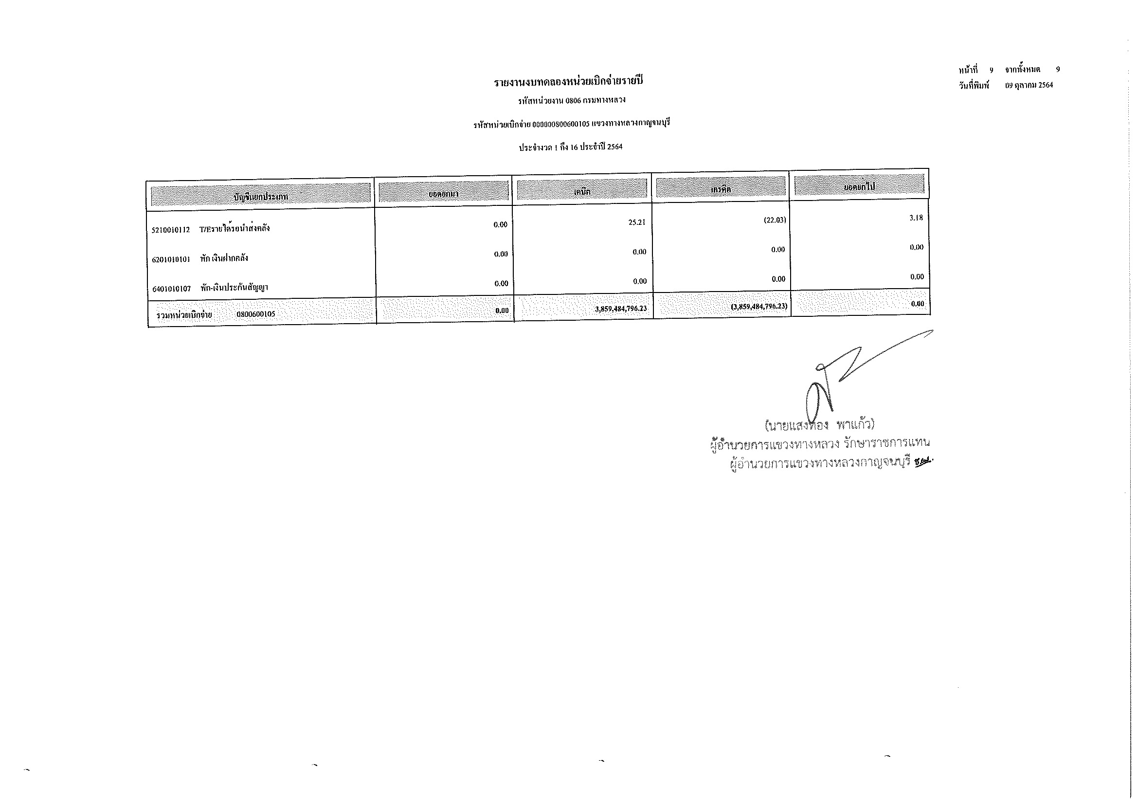 รายงานงบทดลองหน่วยเบิกจ่ายรายปี ประจำงวด 1 ถึง 16 ประจำปีที่ 2564 และ รายละเอียดประกอบรายการบัญชีที่สำคัญของงบทดลอง กรมทางหลวง แขวงทางหลวงกาญจนบุรี ณวันที่ 30 กันยายน 2564