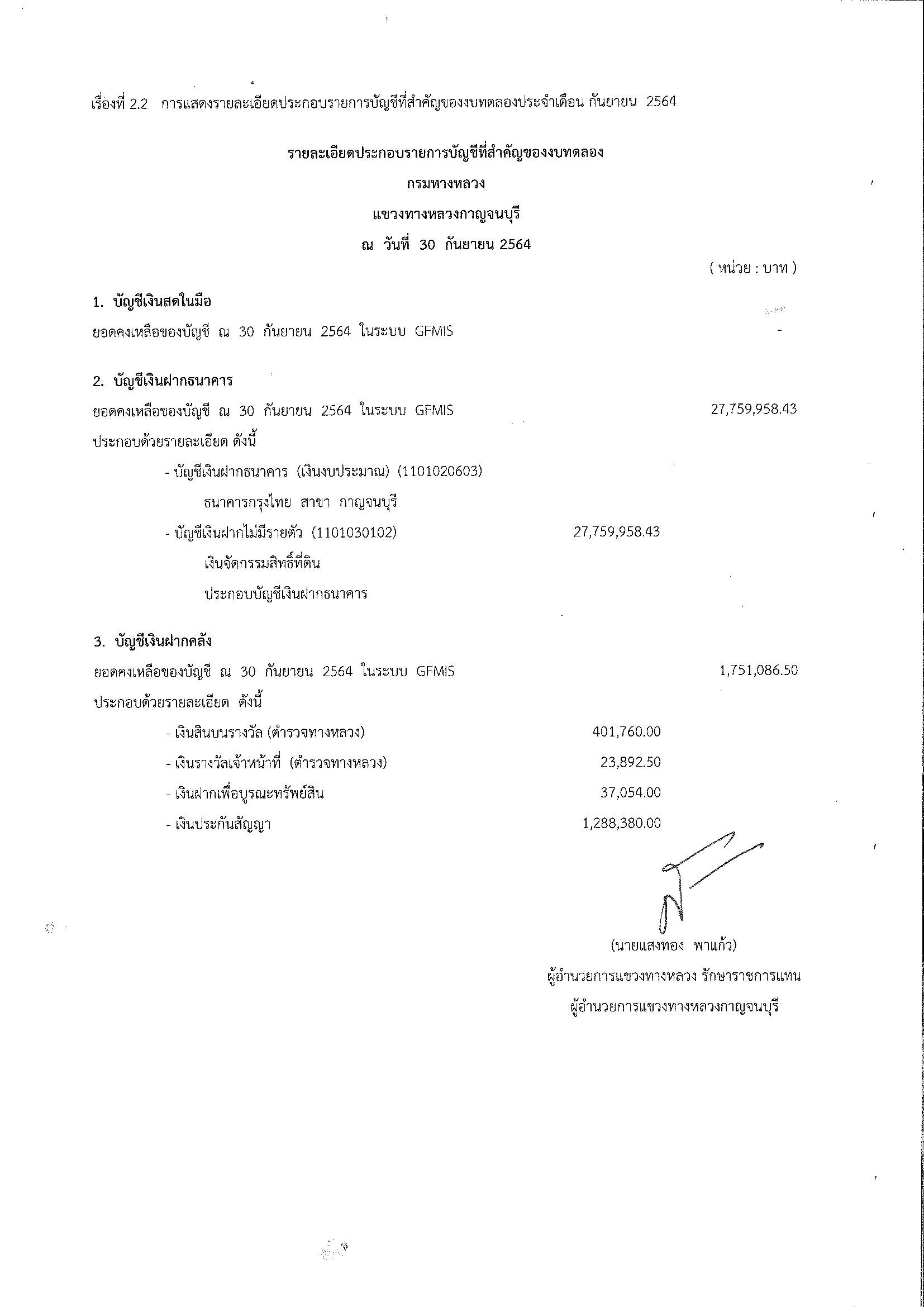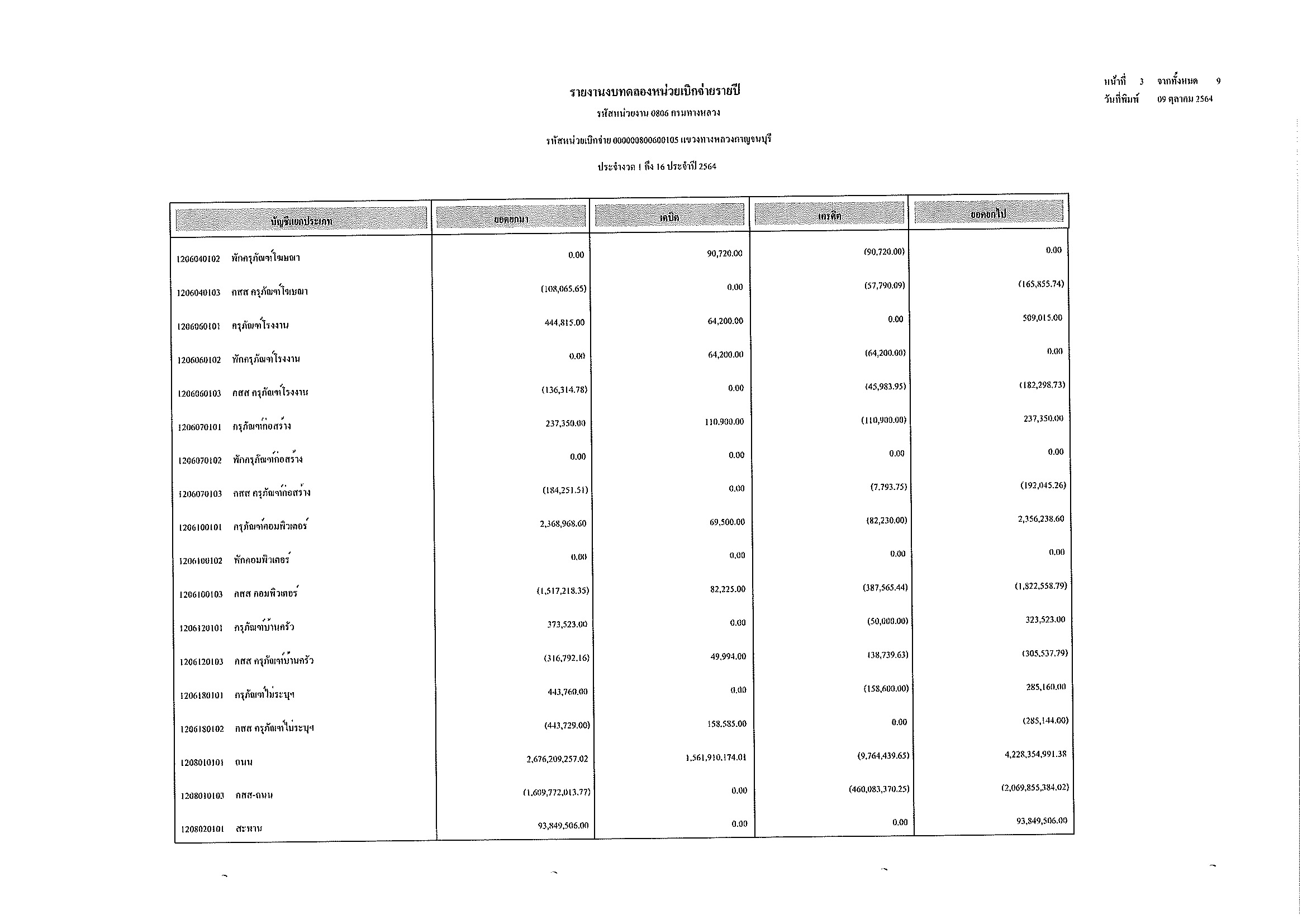 ข้อมูลข่าว : รายงานงบทดลองหน่วยเบิกจ่ายรายปี ประจำงวด 1 ถึง 16 ประจำปีที่ 2564 และ รายละเอียดประกอบรายการบัญชีที่สำคัญของงบทดลอง กรมทางหลวง แขวงทางหลวงกาญจนบุรี ณวันที่ 30 กันยายน 2564