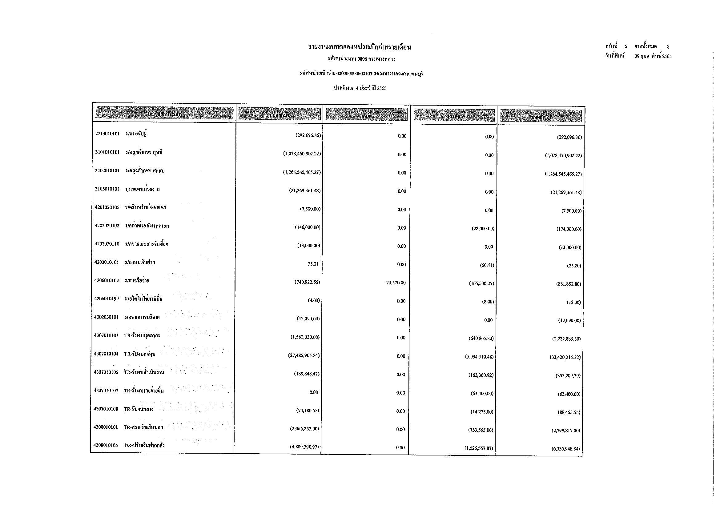 ข้อมูลข่าว : รายงานงบทดลองหน่วยเบิกจ่ายรายเดือน ประจำงวด 4 ประจำปีที่ 2565