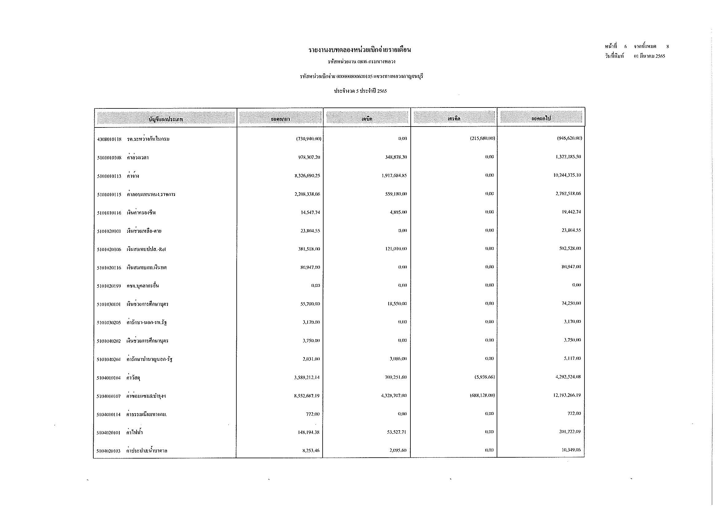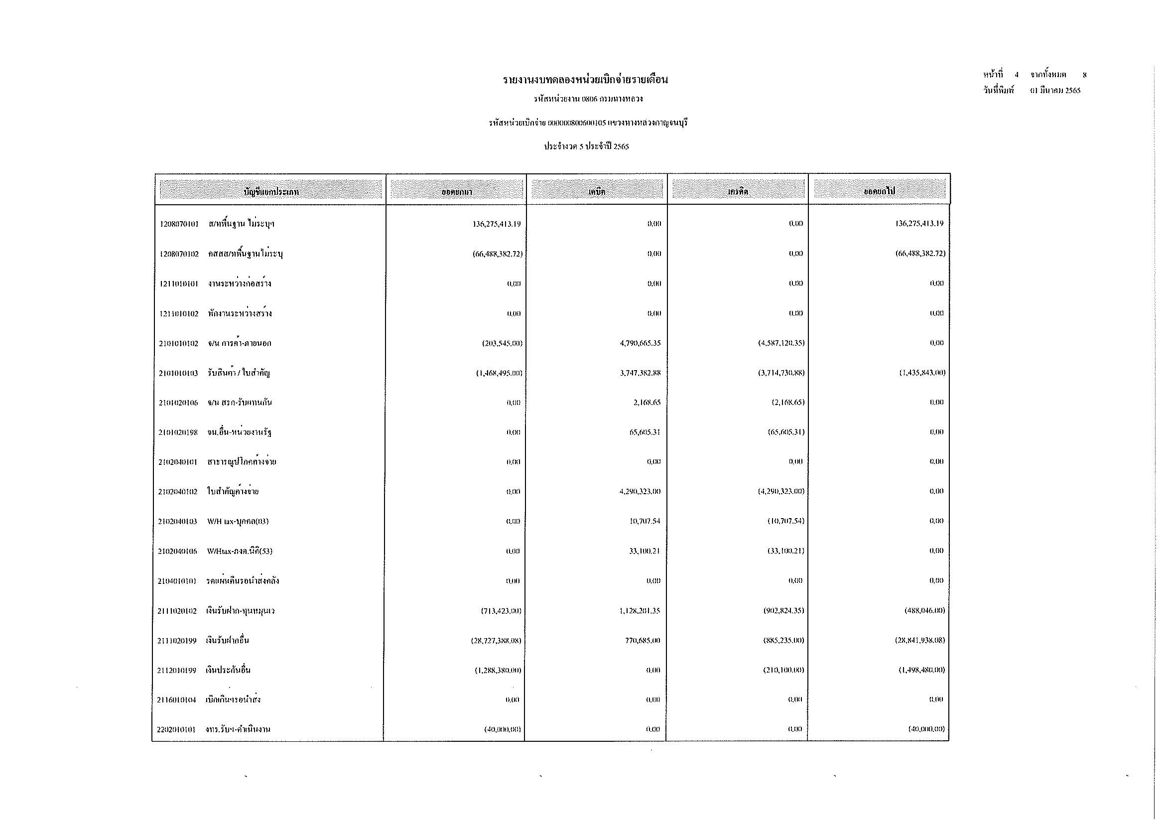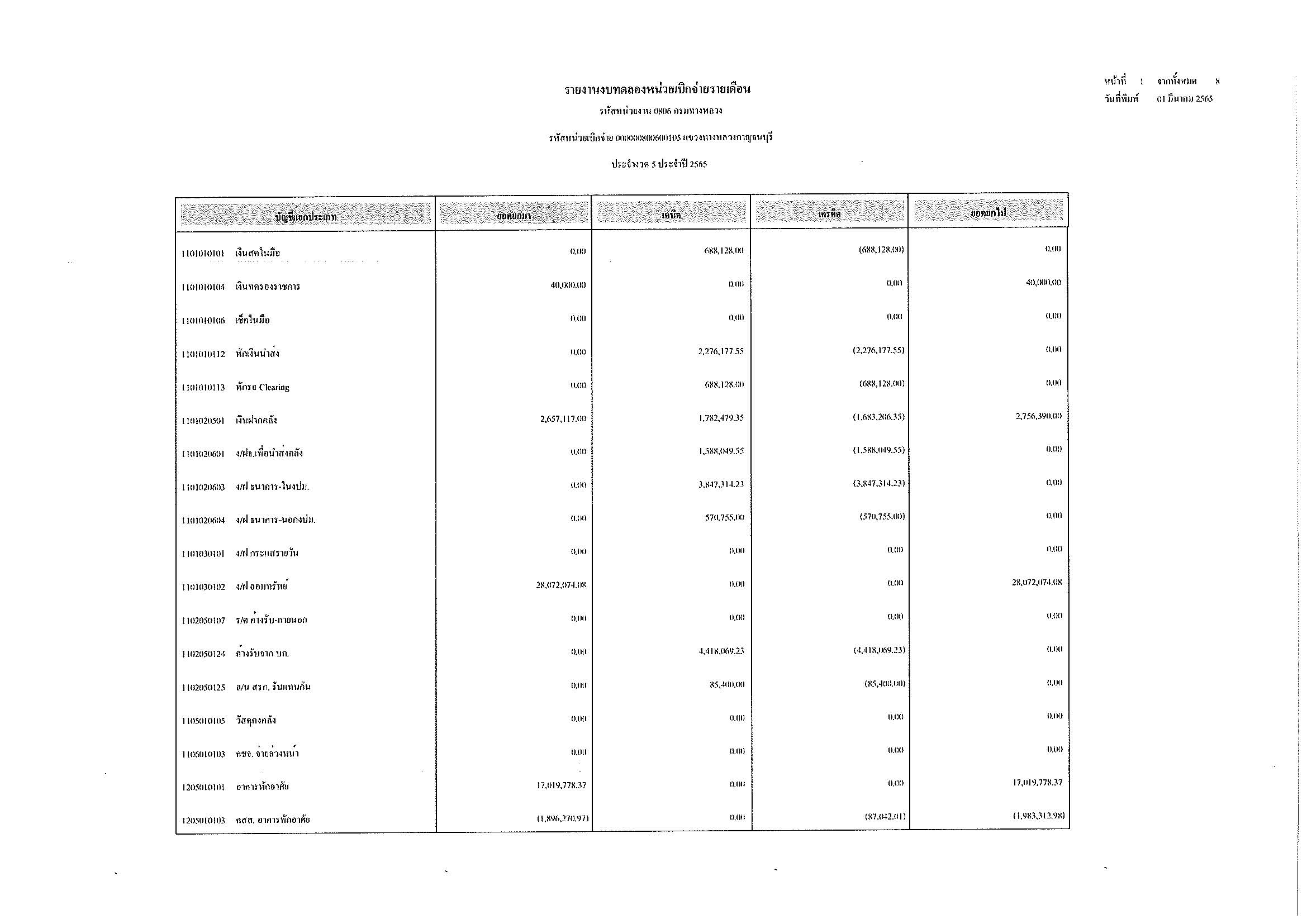 รายงานงบทดลองหน่วยเบิกจ่ายรายเดือน ประจำงวด 5 ประจำปีที่ 2565