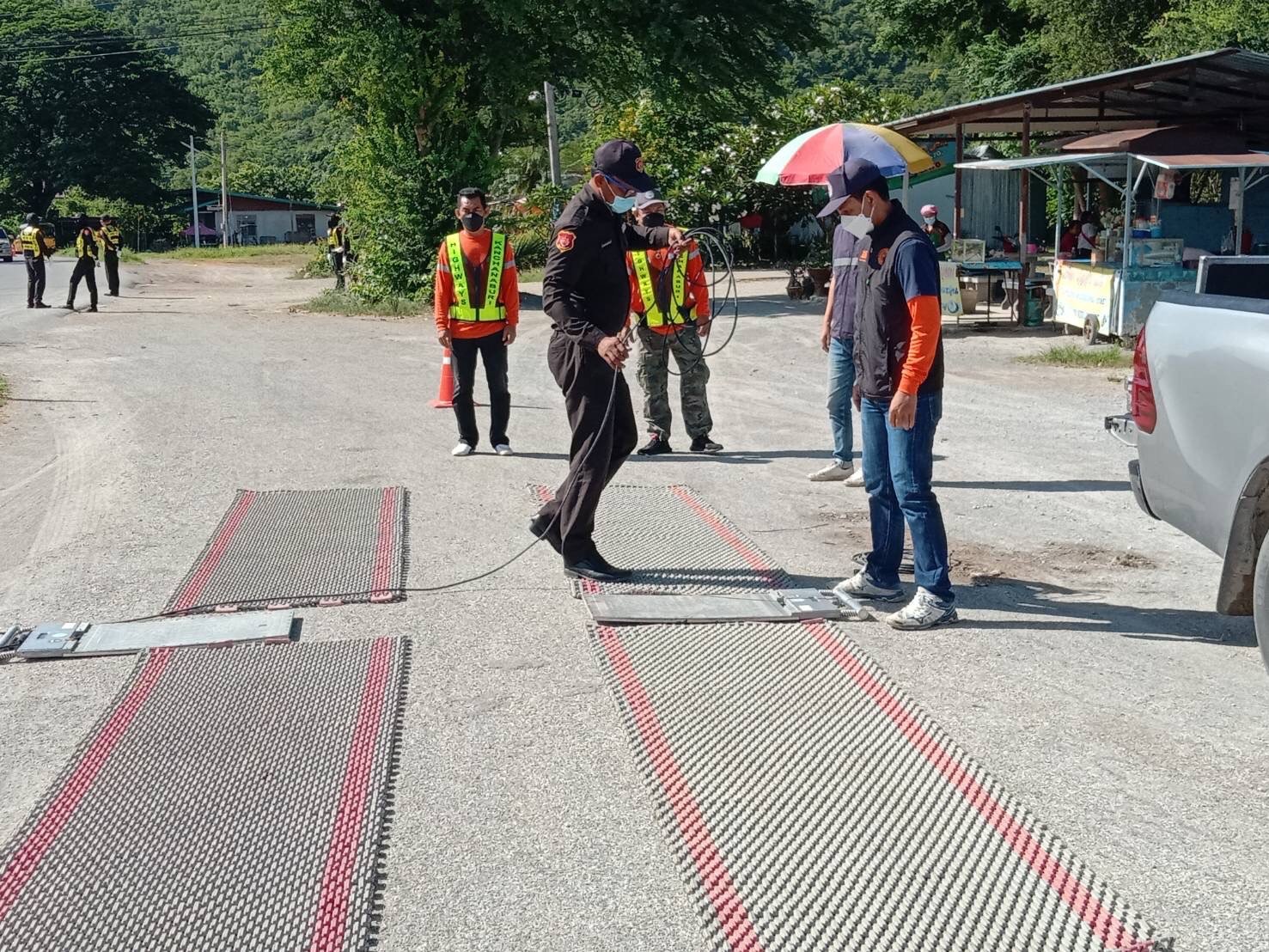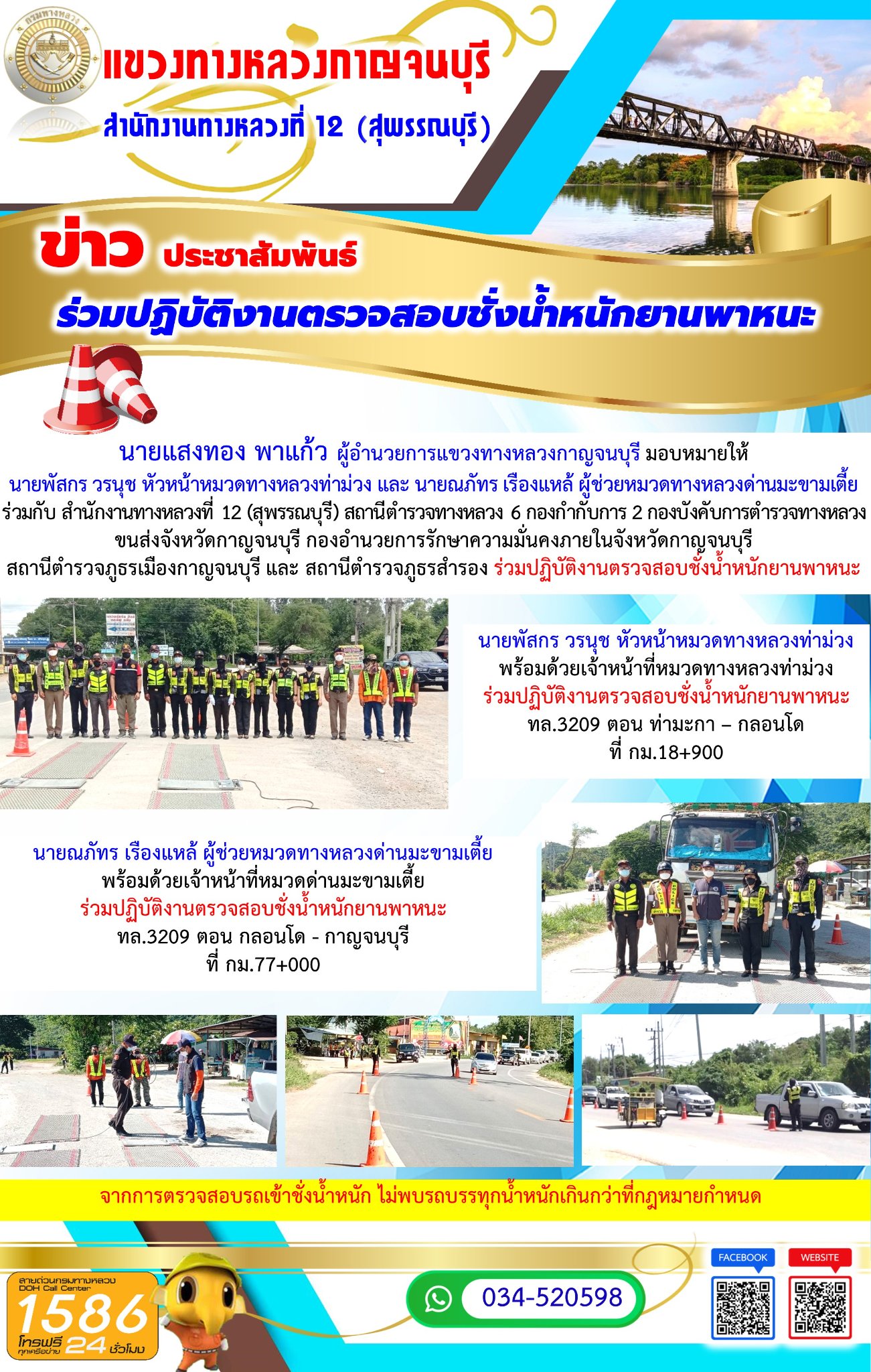 นายแสงทอง พาแก้ว ผู้อำนวยการแขวงทางหลวงกาญจนบุรี มอบหมายให้นายพัสกร วรนุช หัวหน้าหมวดทางหลวงท่าม่วง และ นายณภัทร เรืองแหล้ ผู้ช่วยหมวดทางหลวงด่านมะขามเตี้ย ร่วมกับ สำนักงานทางหลวงที่ 12 (สุพรรณบุรี) สถานีตํารวจทางหลวง 6 กองกํากับการ 2 กองบังคับการตำรวจทางหลวง ขนส่งจังหวัดกาญจนบุรี กองอำนวยการรักษาความมั่นคงภายในจังหวัดกาญจนบุรี สถานีตำรวจภูธรเมืองกาญจนบุรี และ สถานีตำรวจภูธรสำรอง ร่วมปฏิบัติงานตรวจสอบชั่งน้ำหนักยานพาหนะ