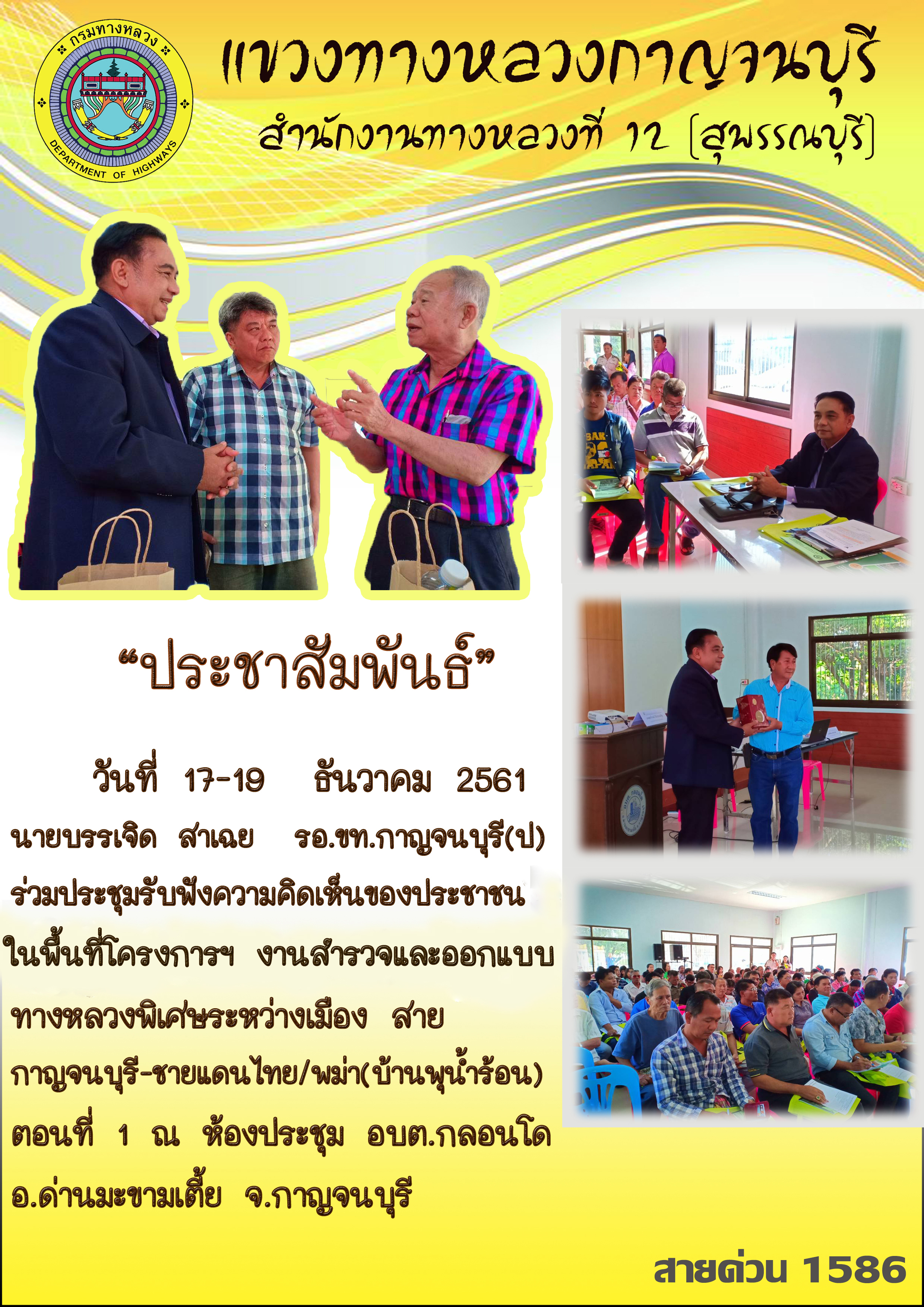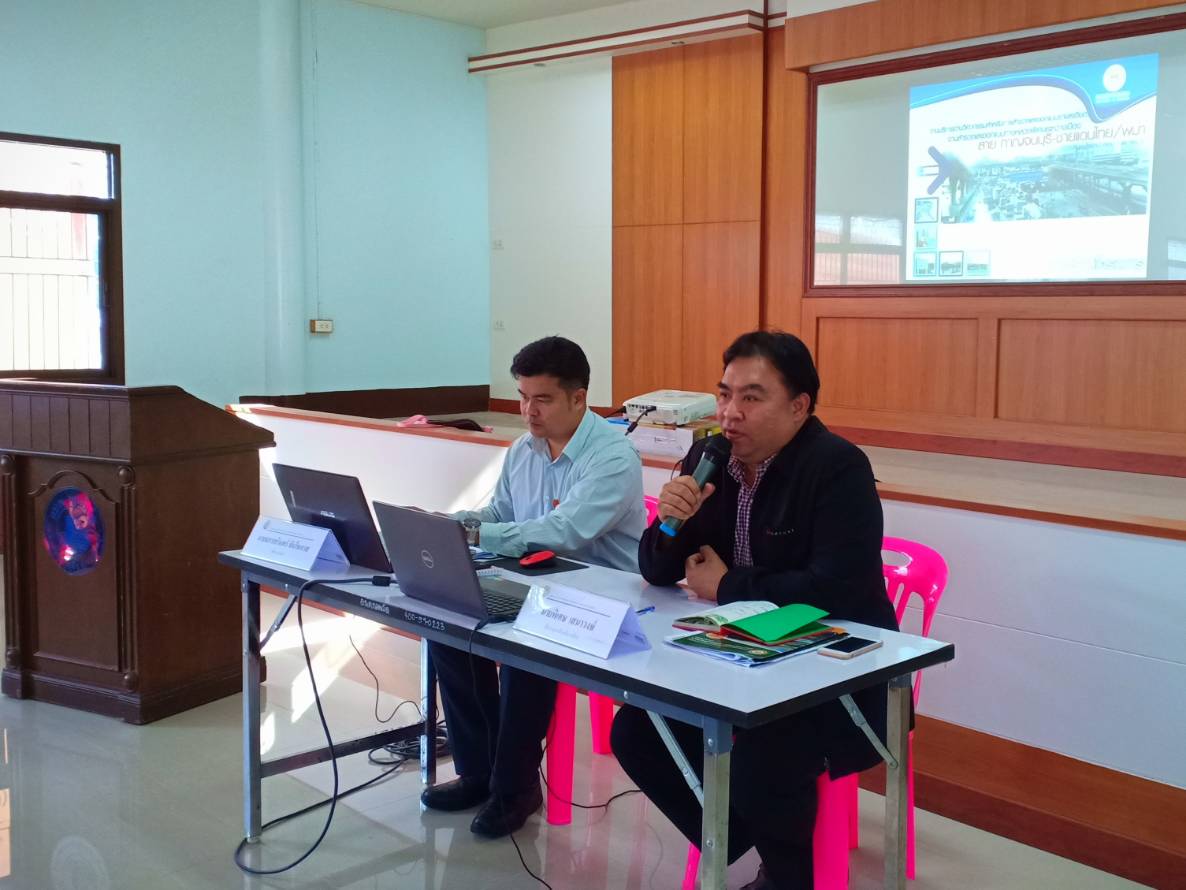 นายบรรเจิด สาเฉย รองผู้อำนวยการฝ่ายปฎิบัติการ แขวงทางหลวงกาญจนบุรี ร่วมประชุมรับฟังความคิดเห็นของประชาชนในพื้นที่โครงการฯ งานสำรวจและออกแบบทางหลวงพิเศษระหว่างเมือง 19/12/61