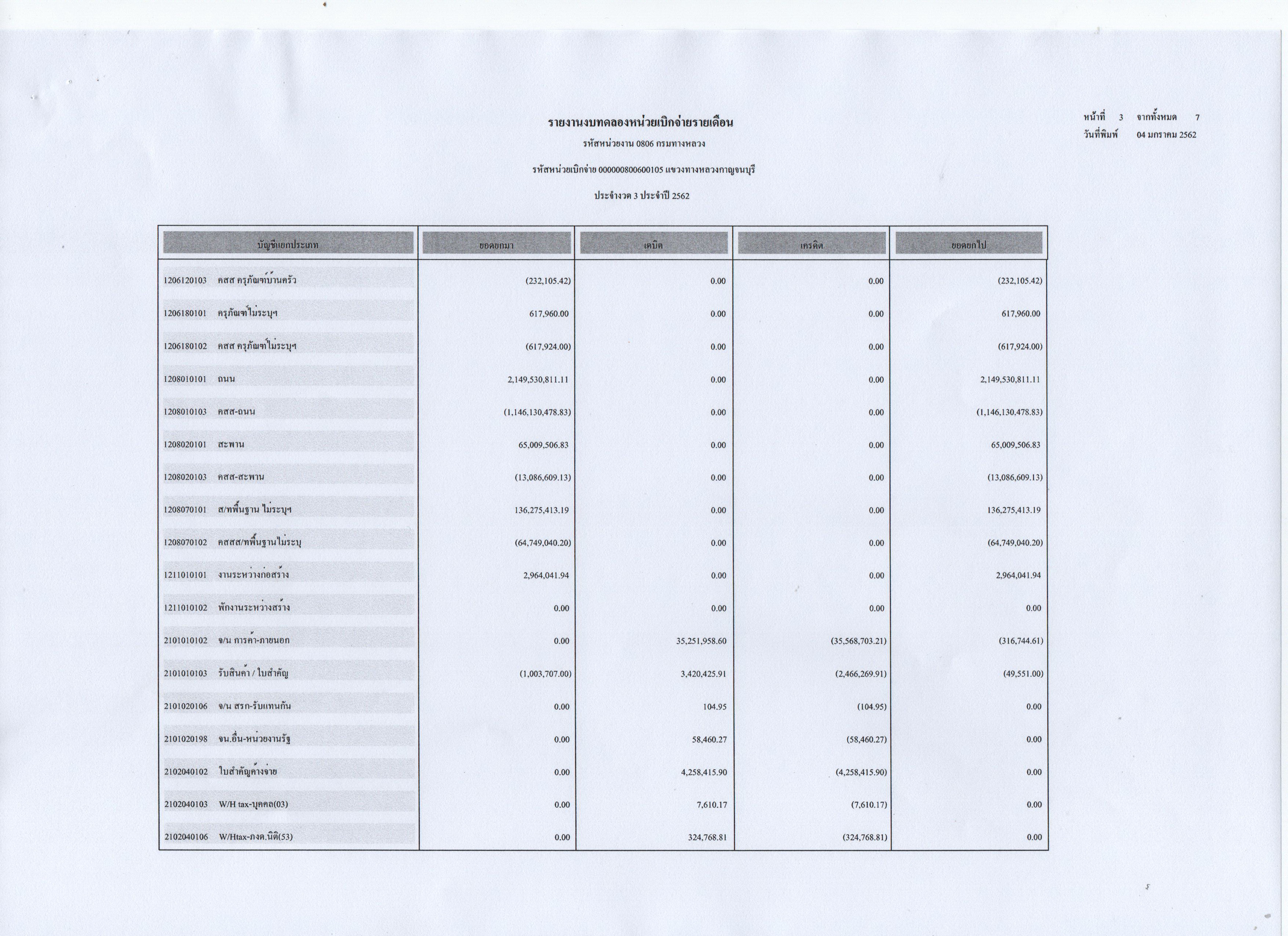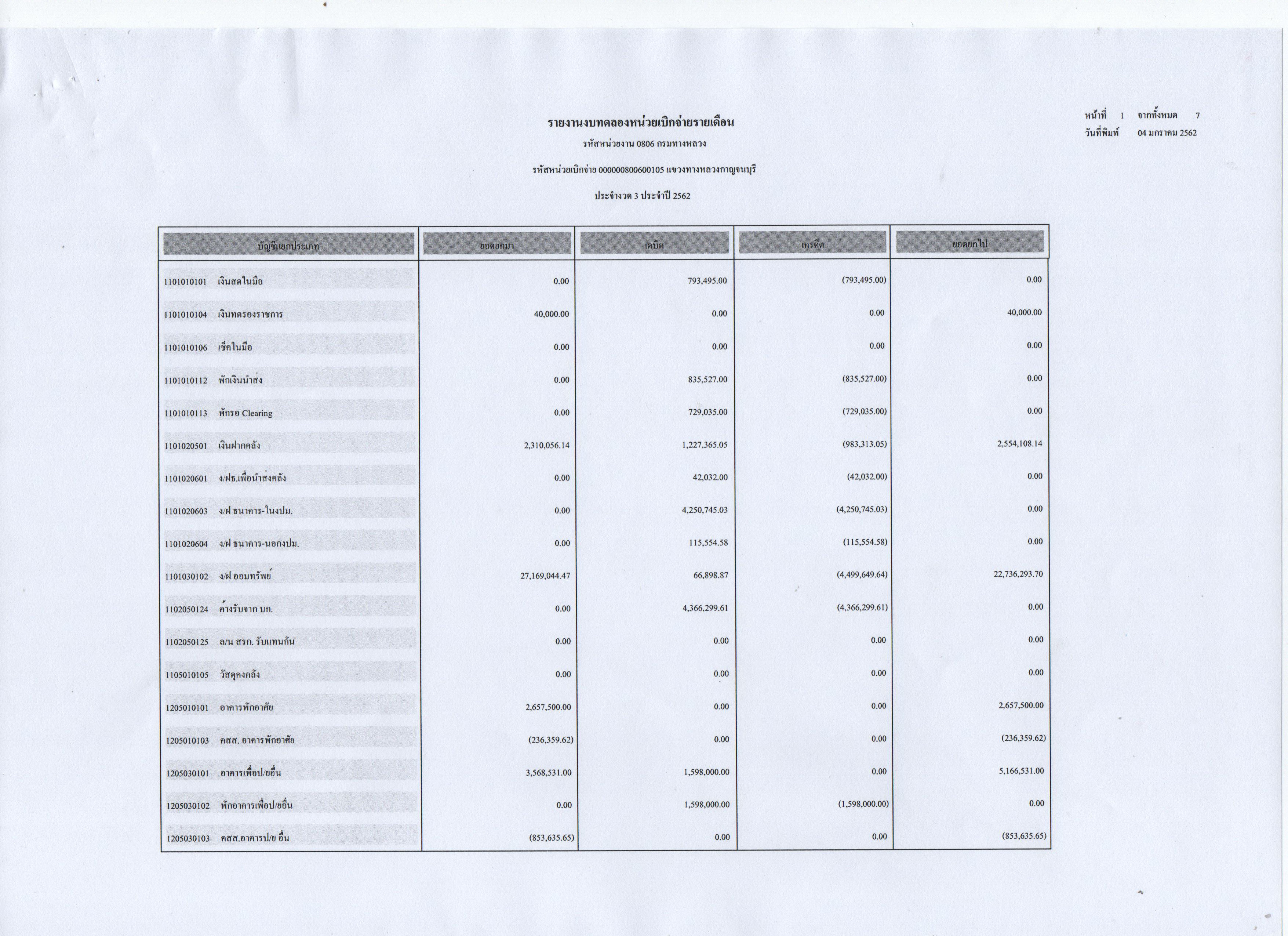 รายงานงบทดลองหน่วยเบิกจ่ายรายเดือน ประจำงวดที่ 3 ประจำปี 2562