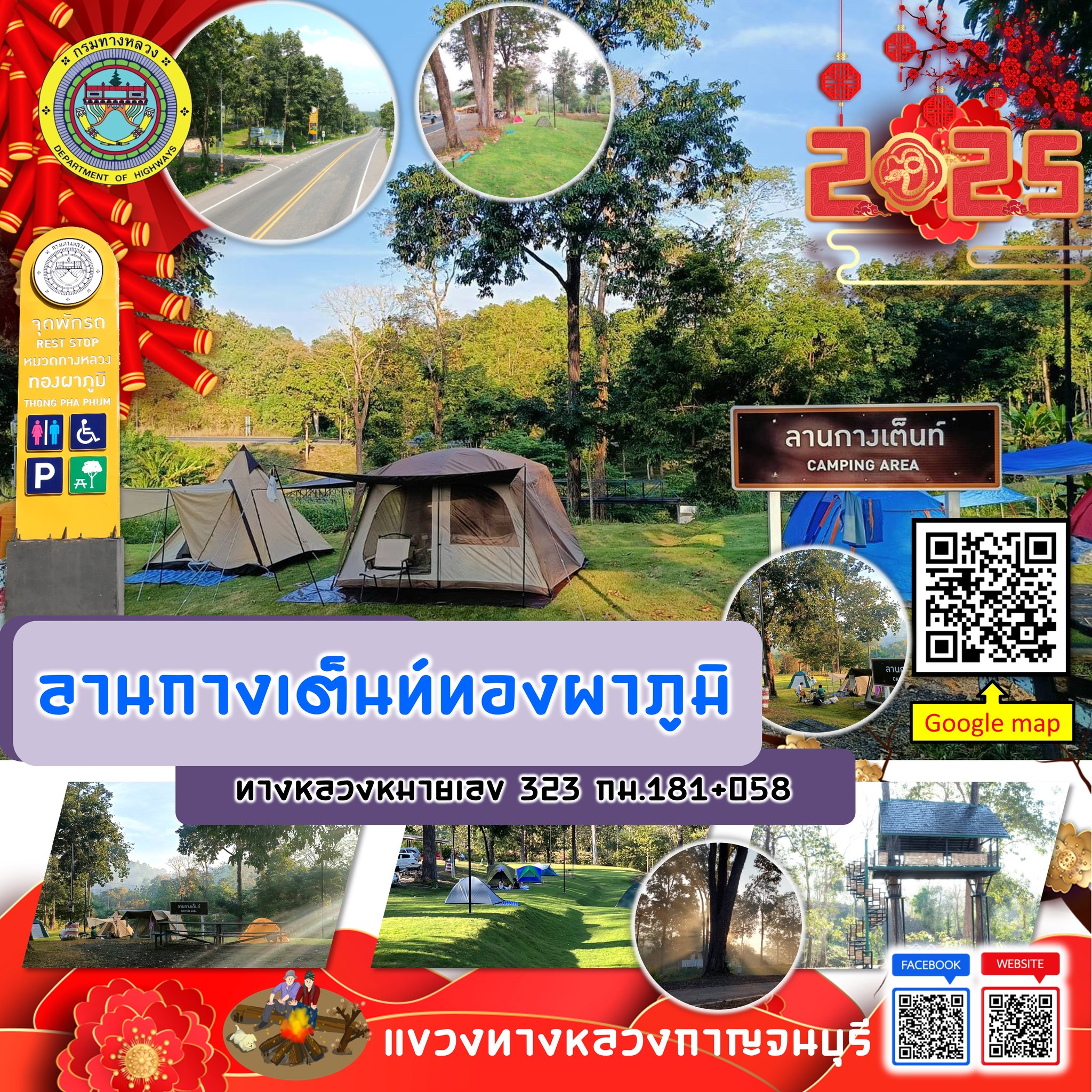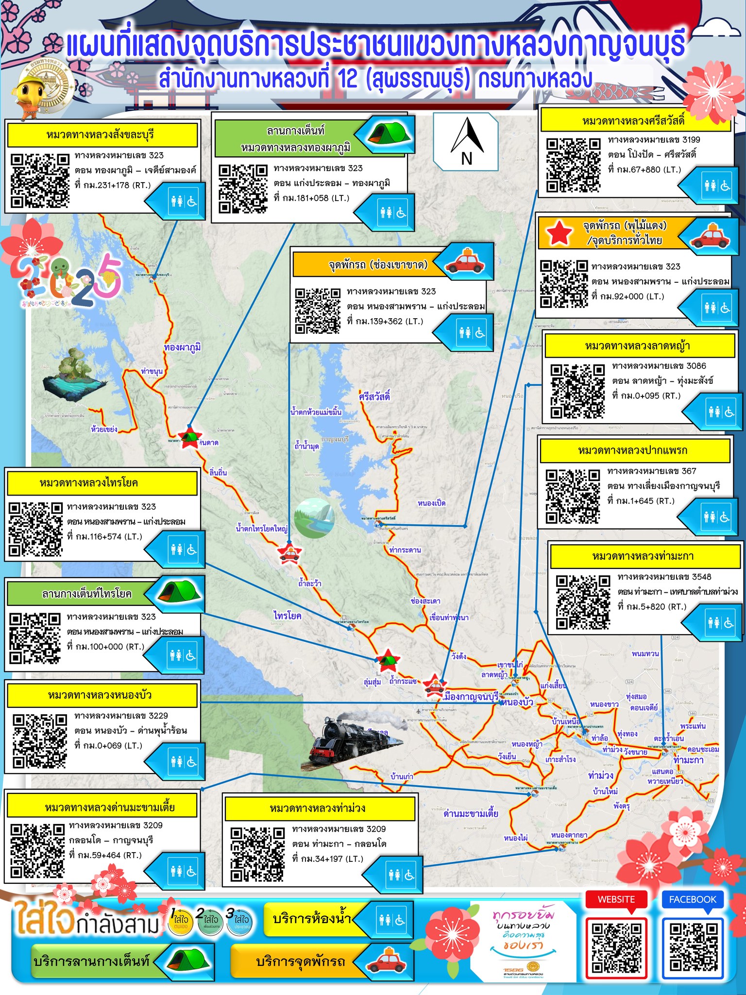 แผนที่แสดงจุดบริการประชาชนแขวงทางหลวงกาญจนบุรี สำนักงานทางหลวงที่ 12 (สุพรรณบุรี) กรมทางหลวง จุดบริการลานกางเต็นท์ จุดพักรถ ห้องน้ำ และสอบถามข้อมูลต่างๆ สำหรับนักท่องเที่ยวแวะพักใช้บริการ โดยมีเจ้าหน้าที่พร้อมบริการตลอด 24 ชั่วโมง ในช่วงเทศกาลปีใหม่ 2568