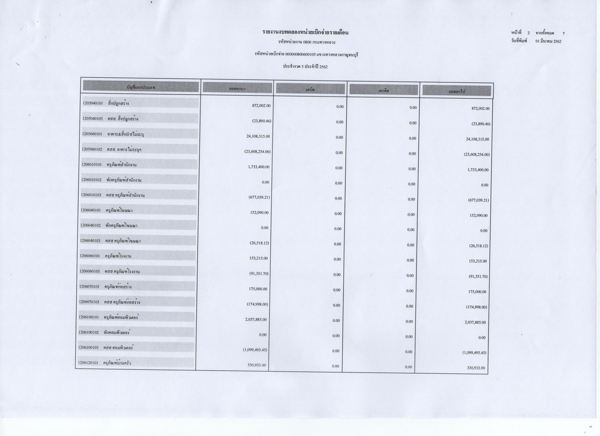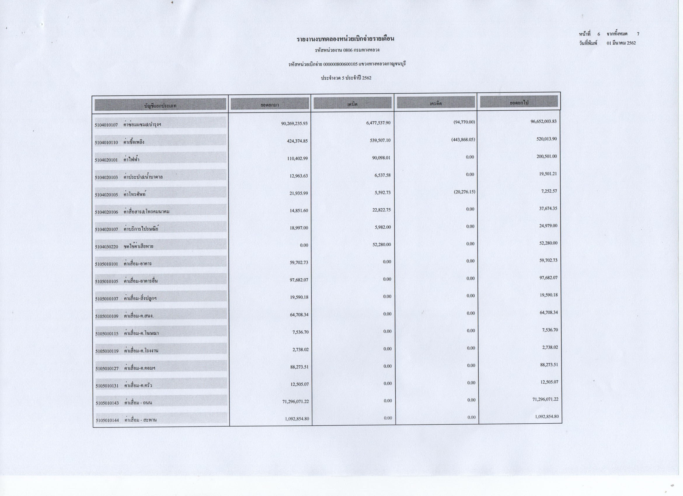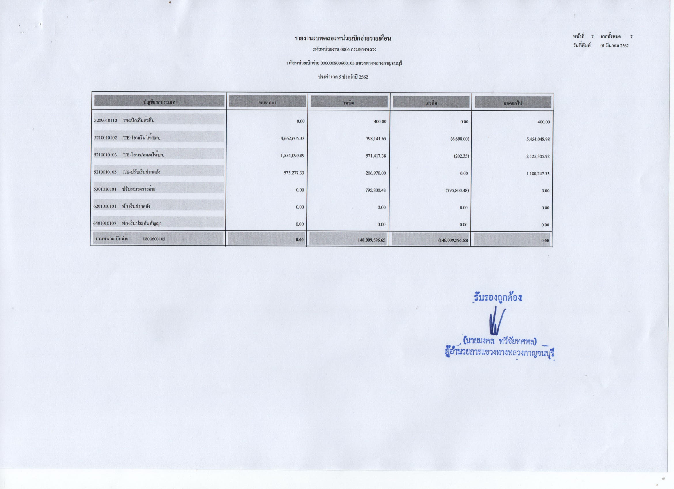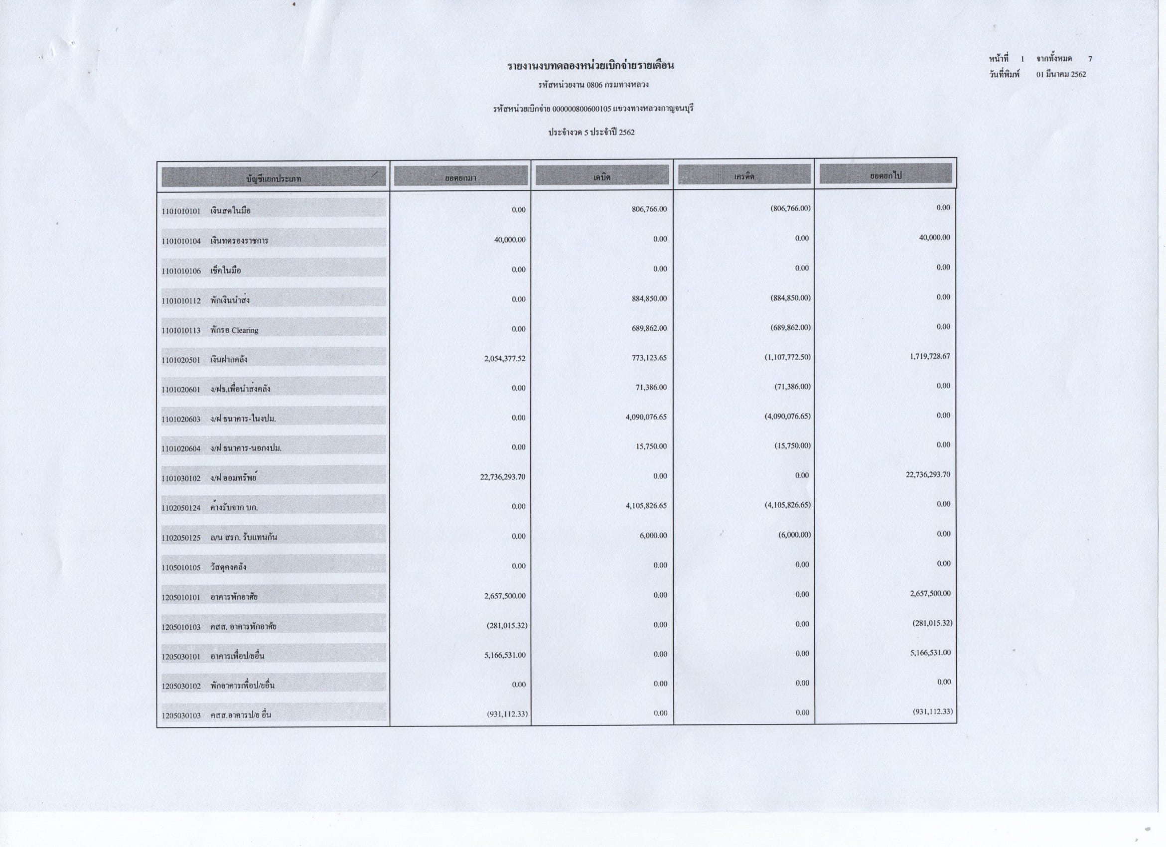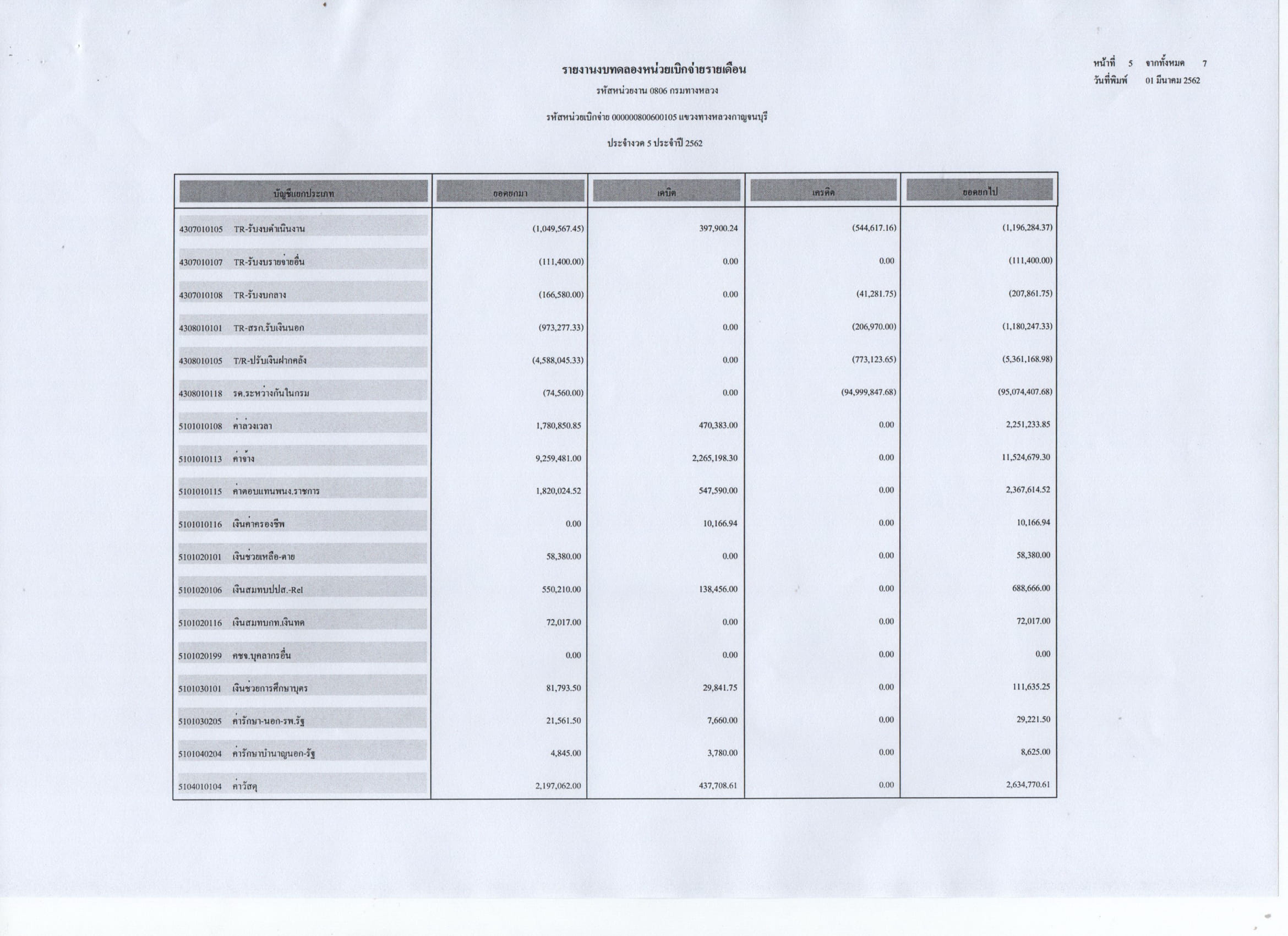 รายงานงบทดลองหน่วยเบิกจ่ายรายเดือน ประจำงวดที่ 5 ประจำปี 2562