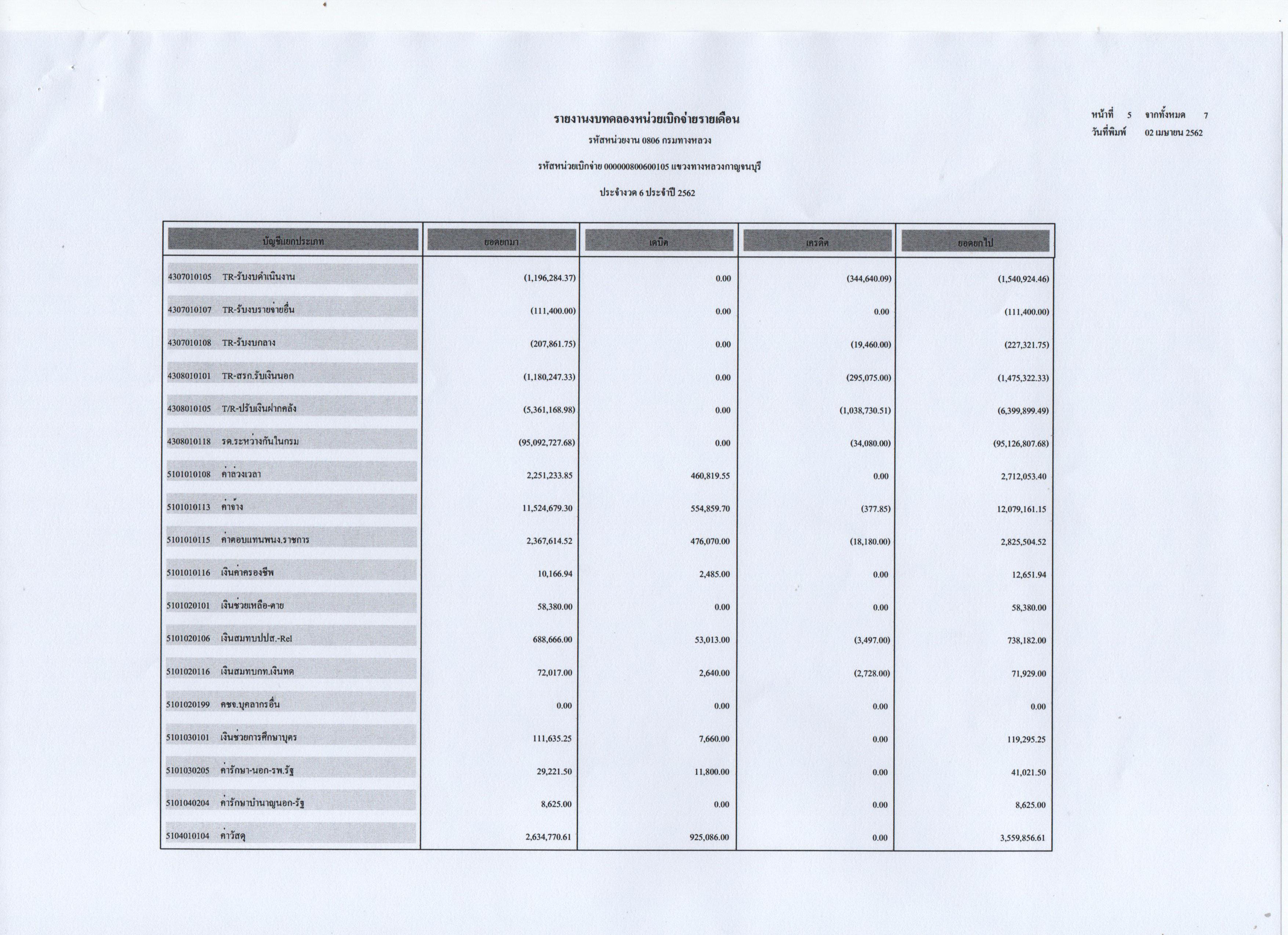ข้อมูลข่าว : รายงานงบทดลองหน่วยเบิกจ่ายรายเดือน ประจำงวดที่ 6 ประจำปี 2562