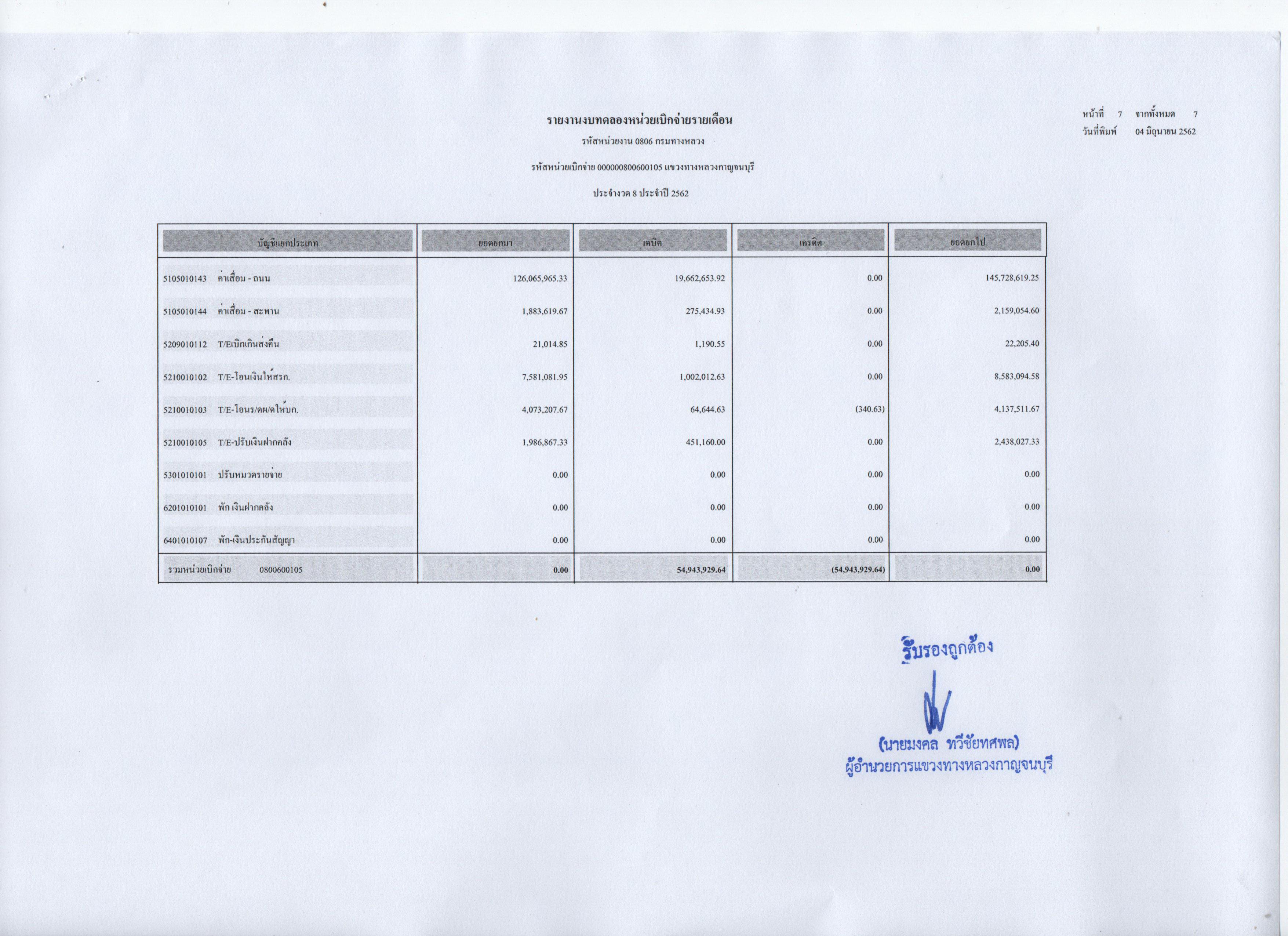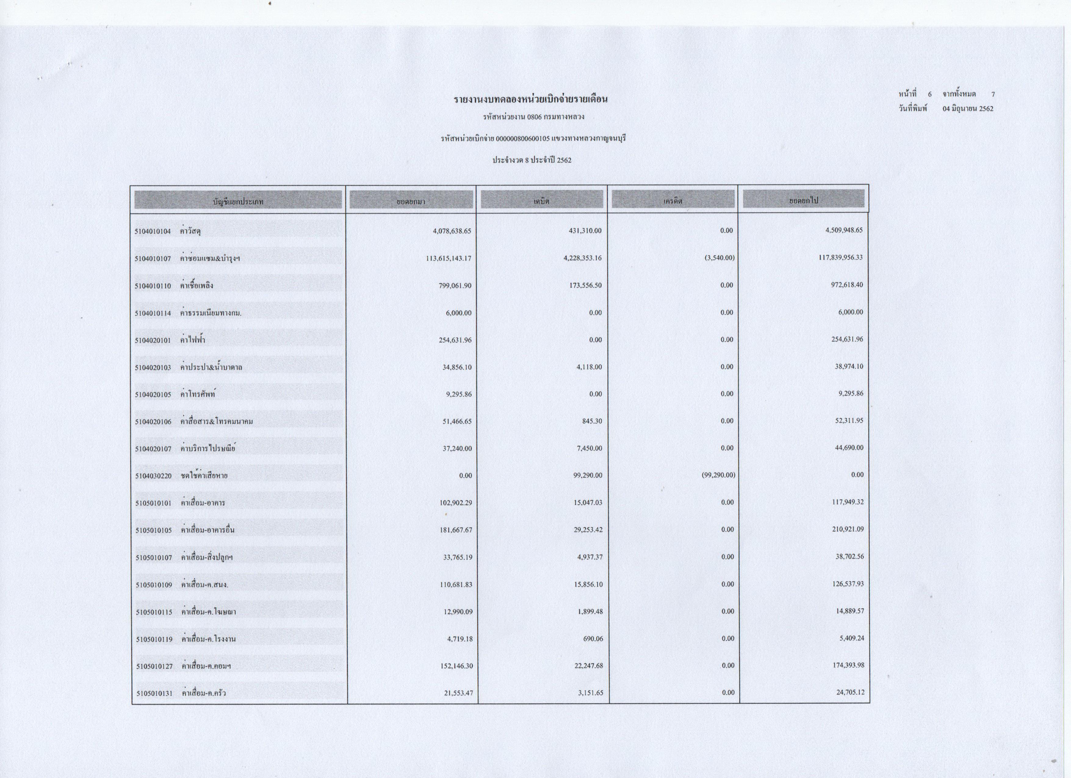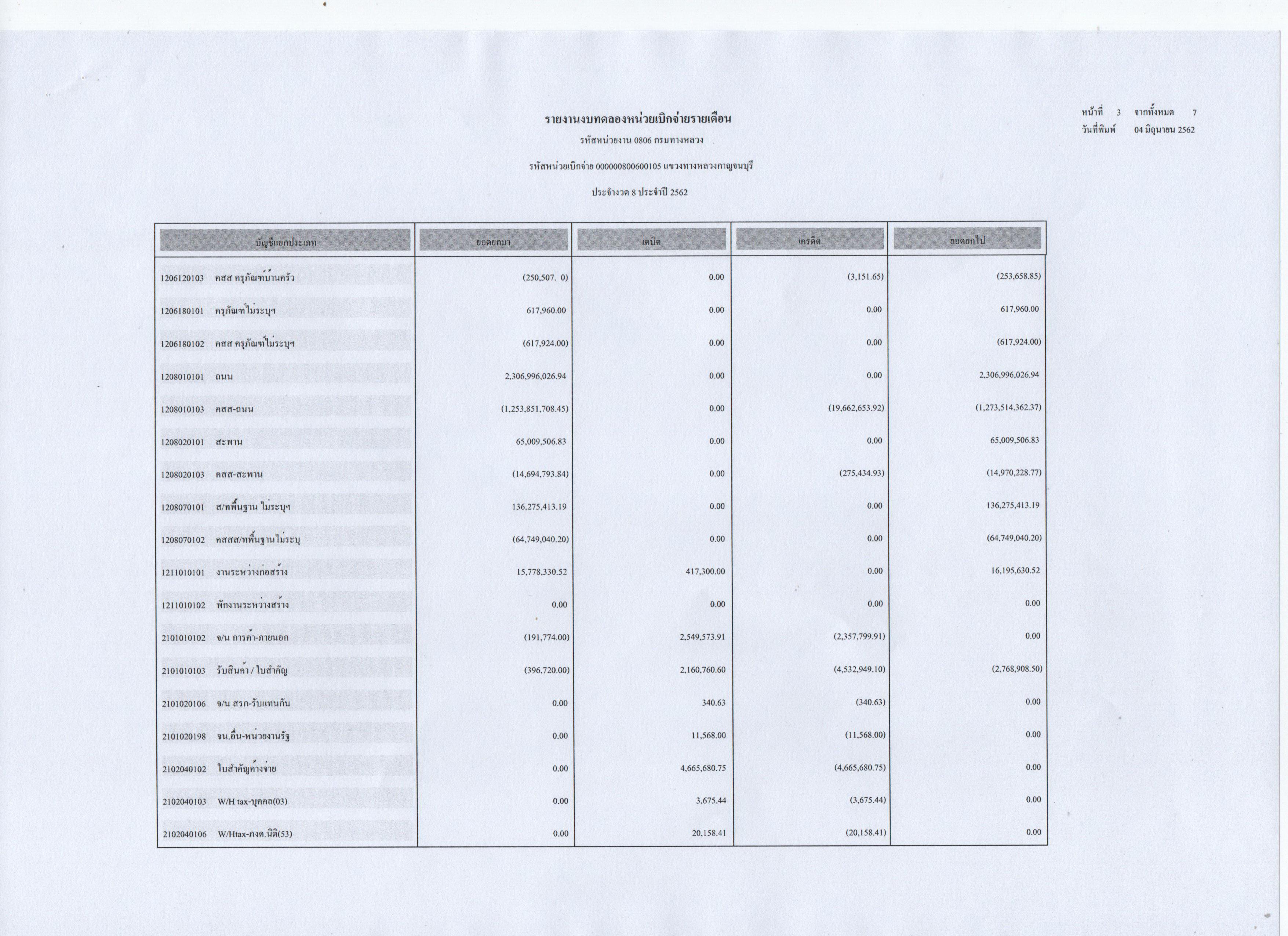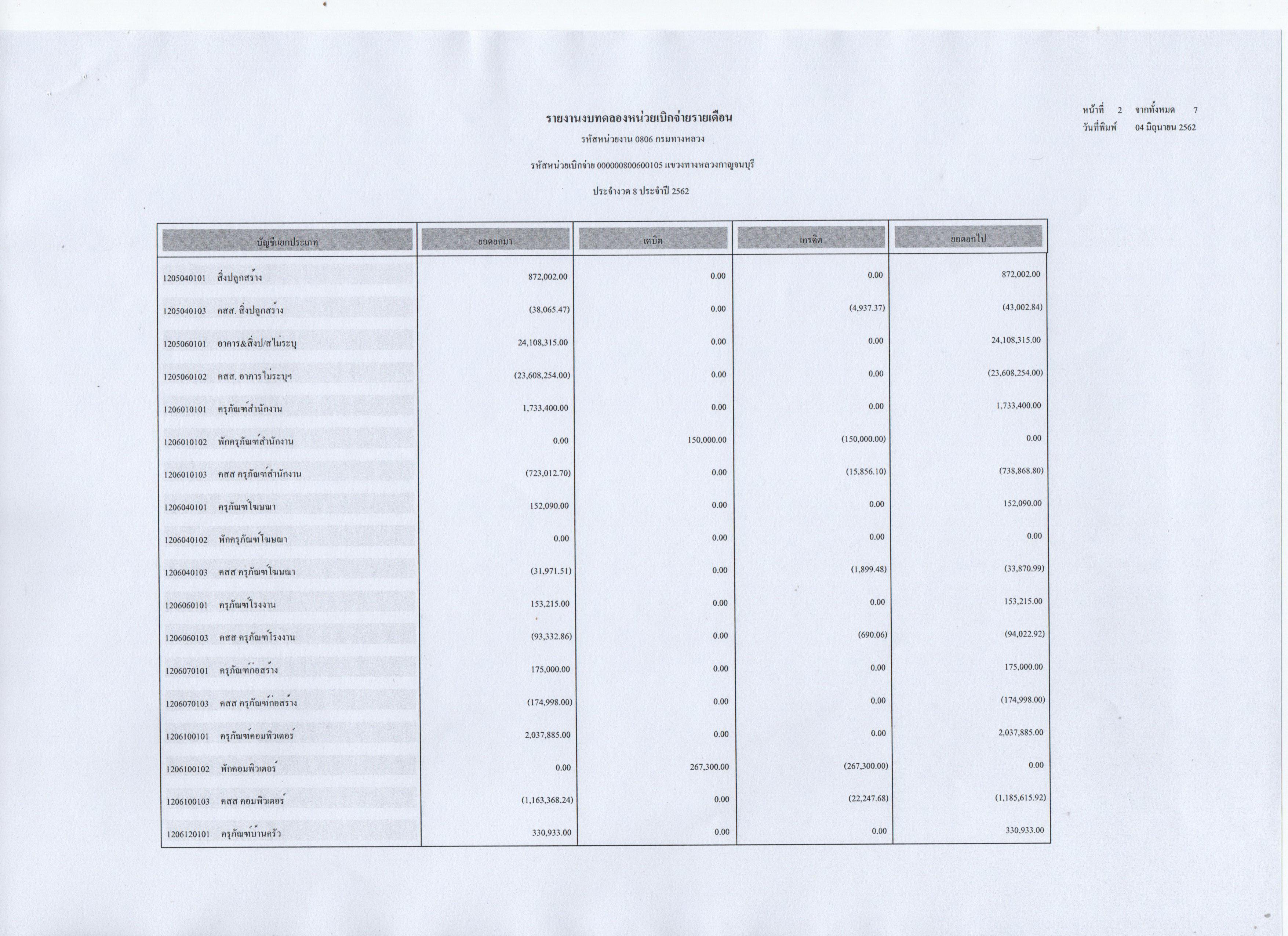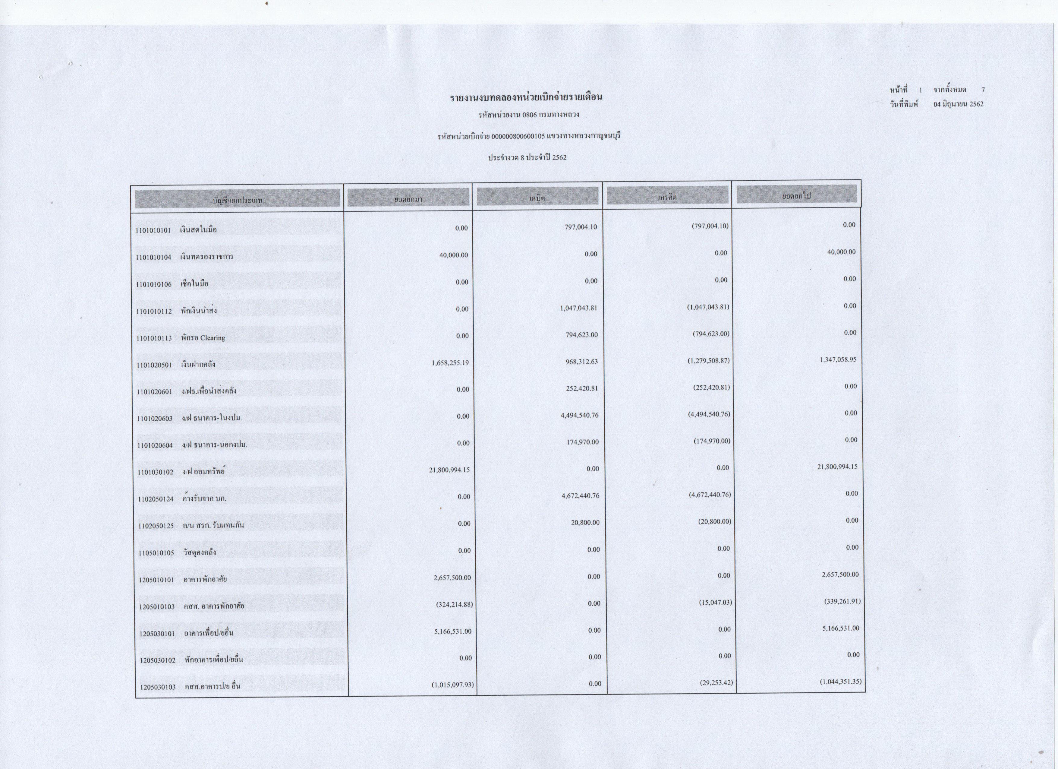 รายงานงบทดลองหน่วยเบิกจ่ายรายเดือน ประจำงวดที่ 8 ประจำปี 2562