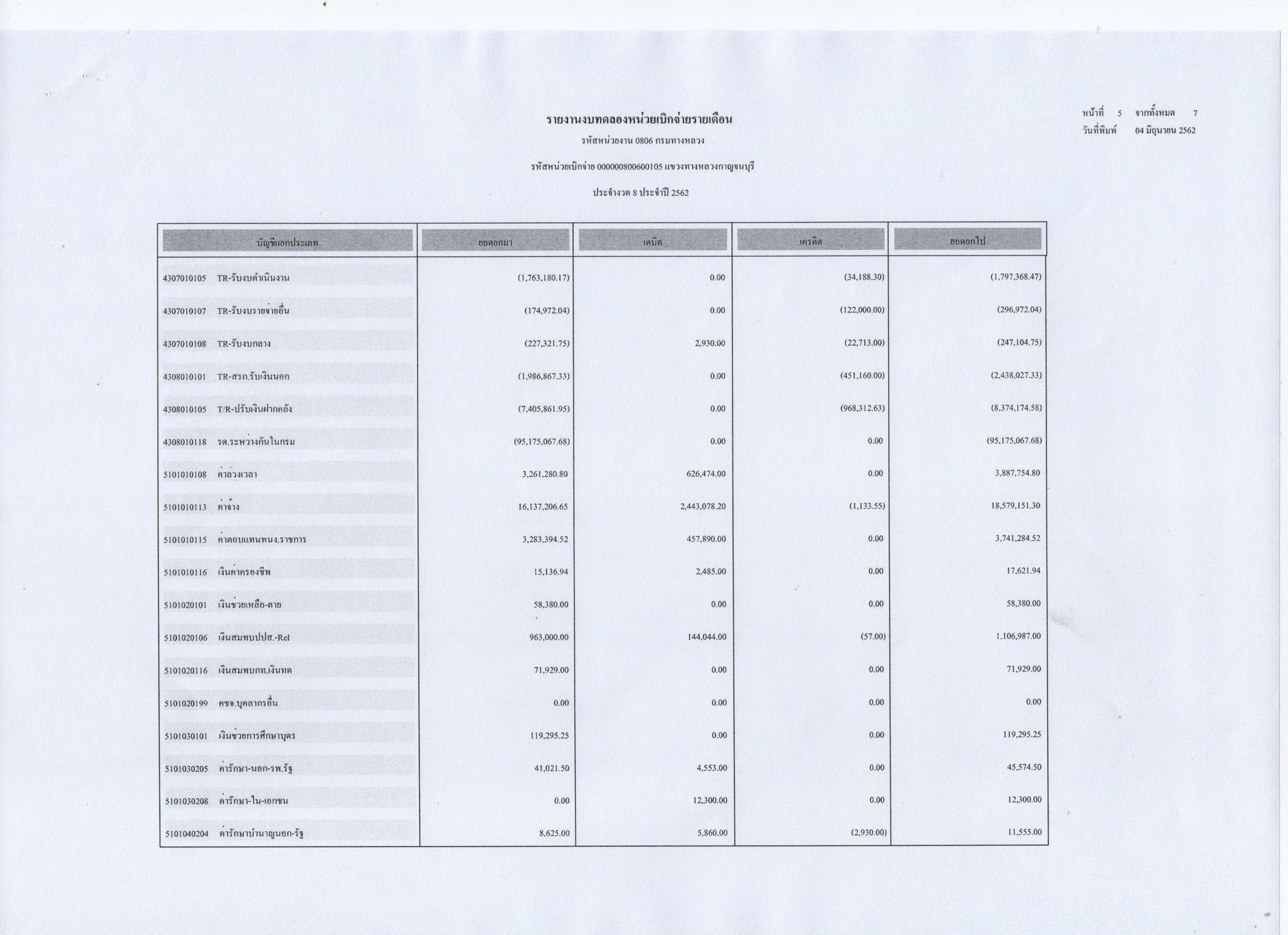 ข้อมูลข่าว : รายงานงบทดลองหน่วยเบิกจ่ายรายเดือน ประจำงวดที่ 8 ประจำปี 2562
