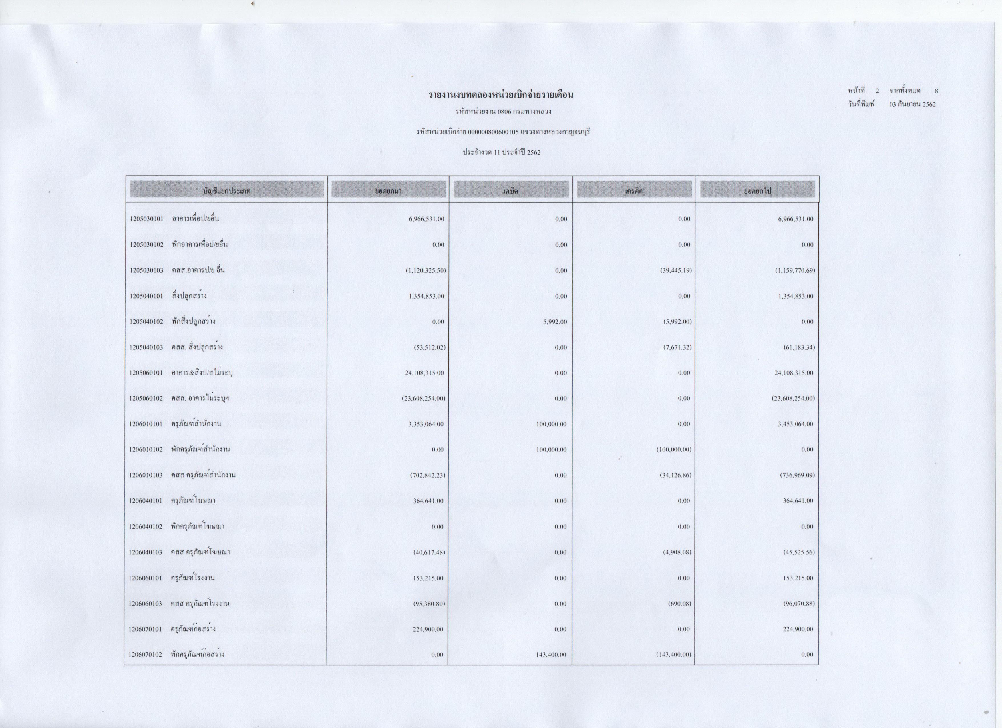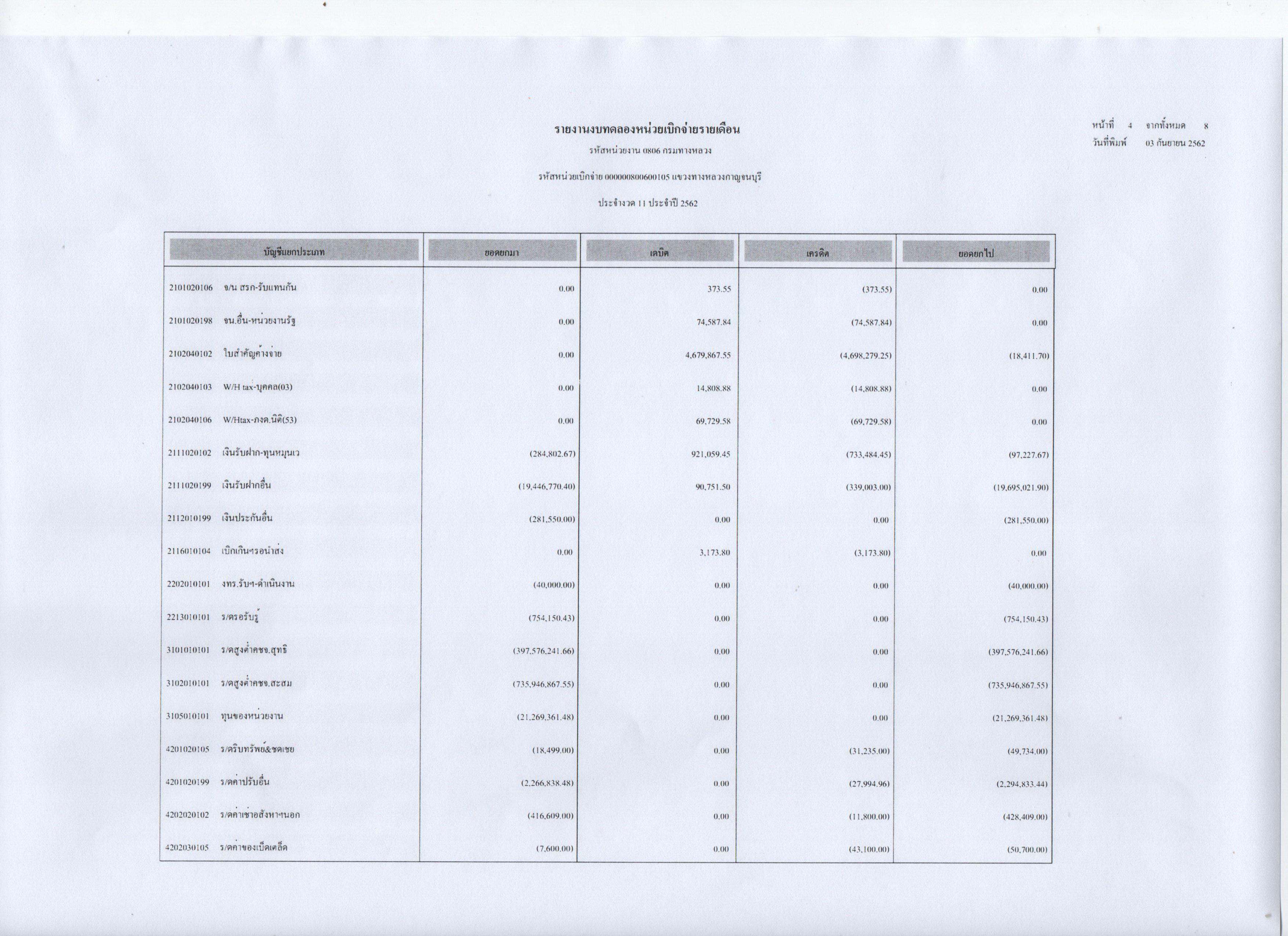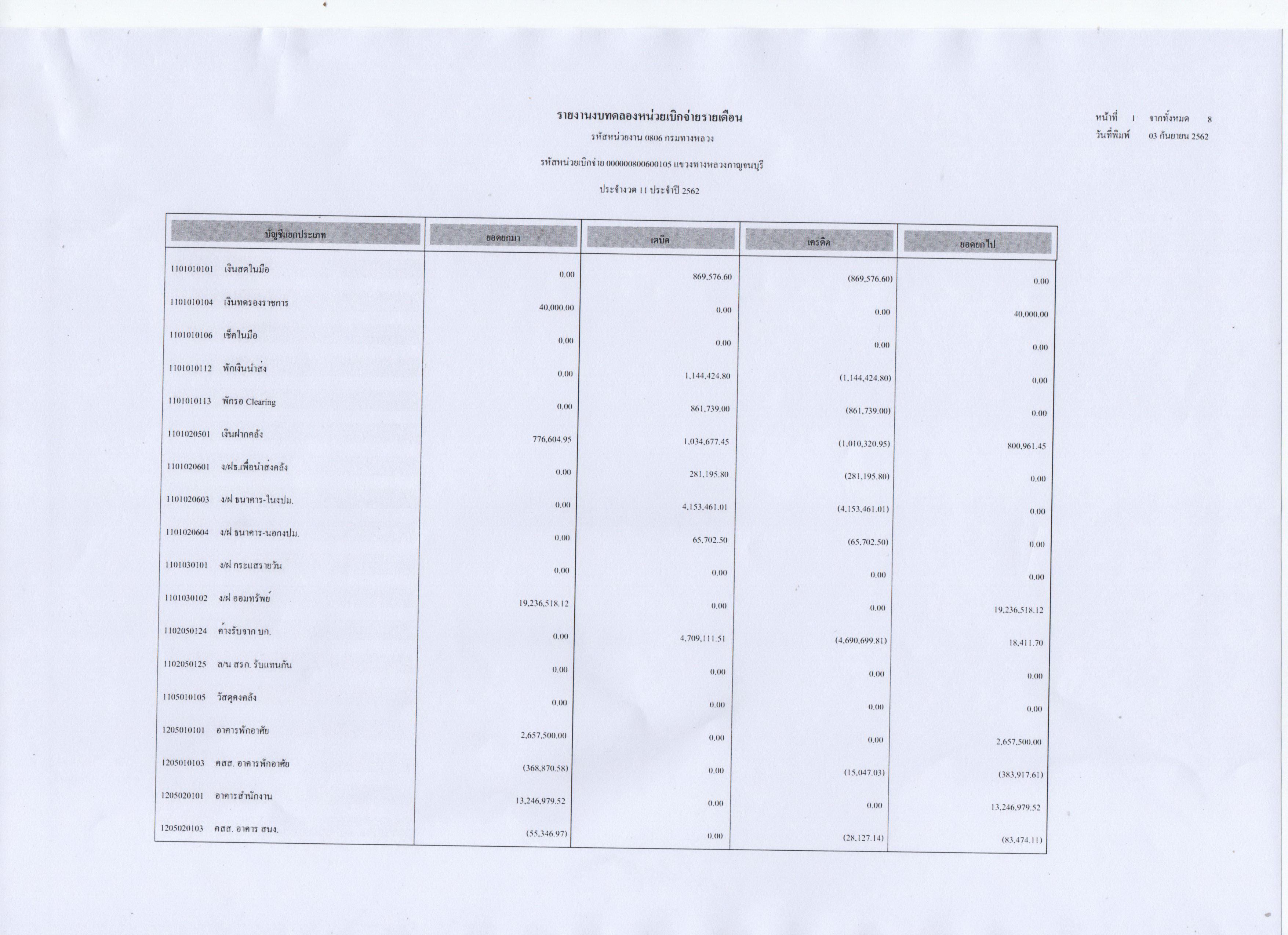 รายงานงบทดลองหน่วยเบิกจ่ายรายเดือน ประจำงวดที่ 11 ประจำปี 2562