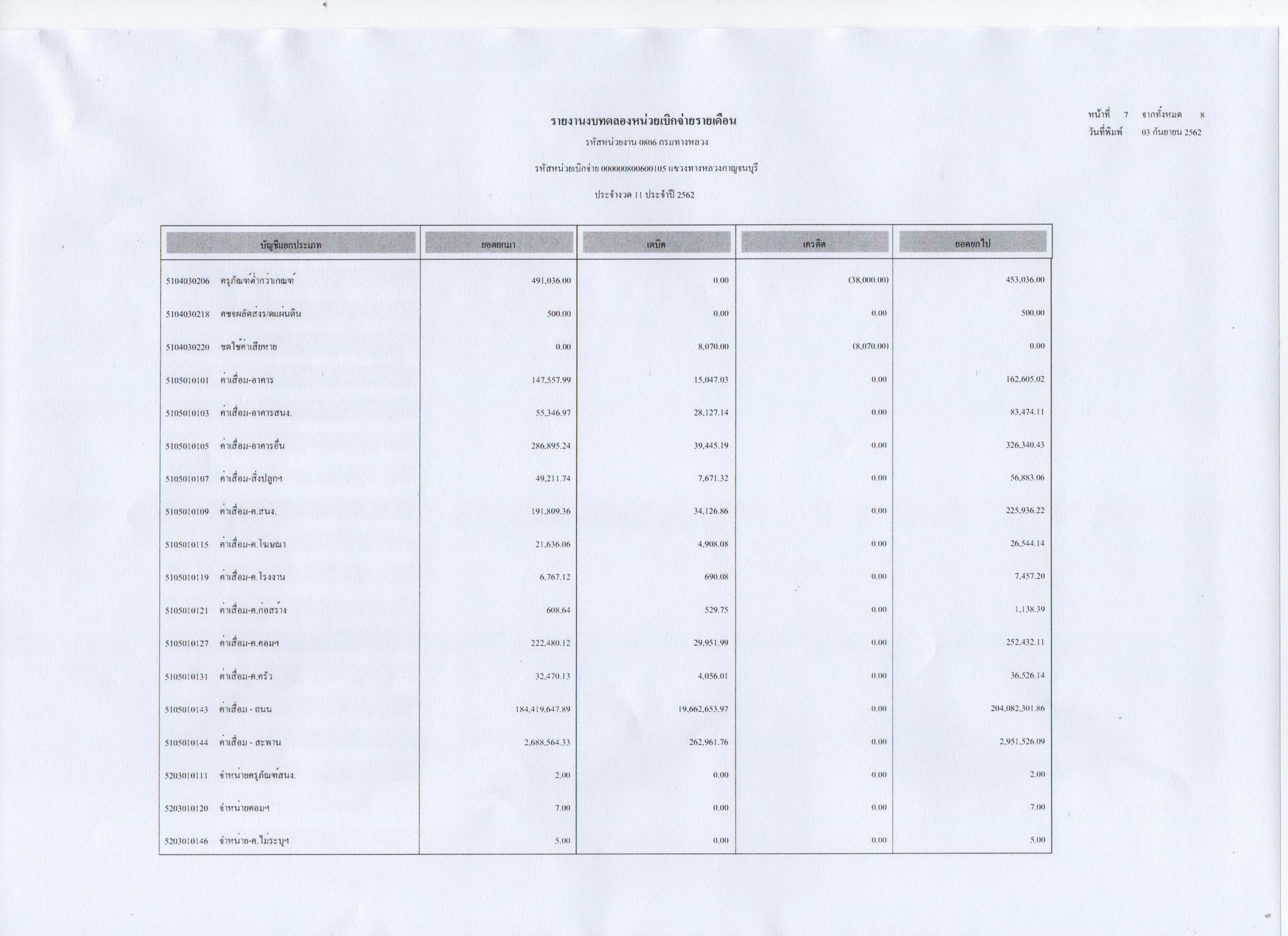 ข้อมูลข่าว : รายงานงบทดลองหน่วยเบิกจ่ายรายเดือน ประจำงวดที่ 11 ประจำปี 2562