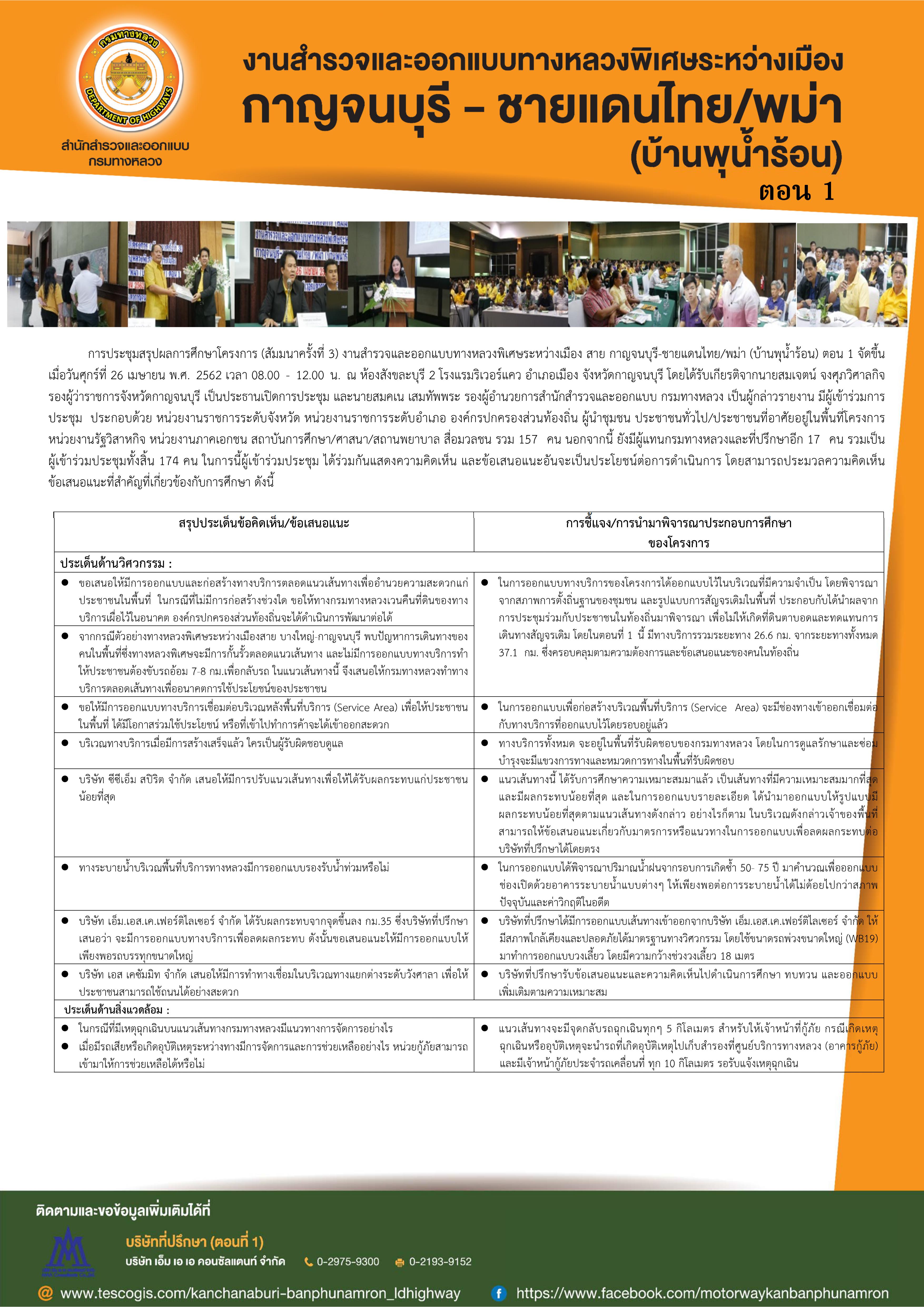 ประชาสัมพันธ์ สรุปผลการประชุมผลการศึกษาโครงการ (สัมนาครั้งที่ 3) งานสำรวจและออกแบบทางหลวงพิเศษระหว่างเมือง กาญจนบุรี - ชายแดนไทย/พม่า(บ้านพุน้ำร้อน)