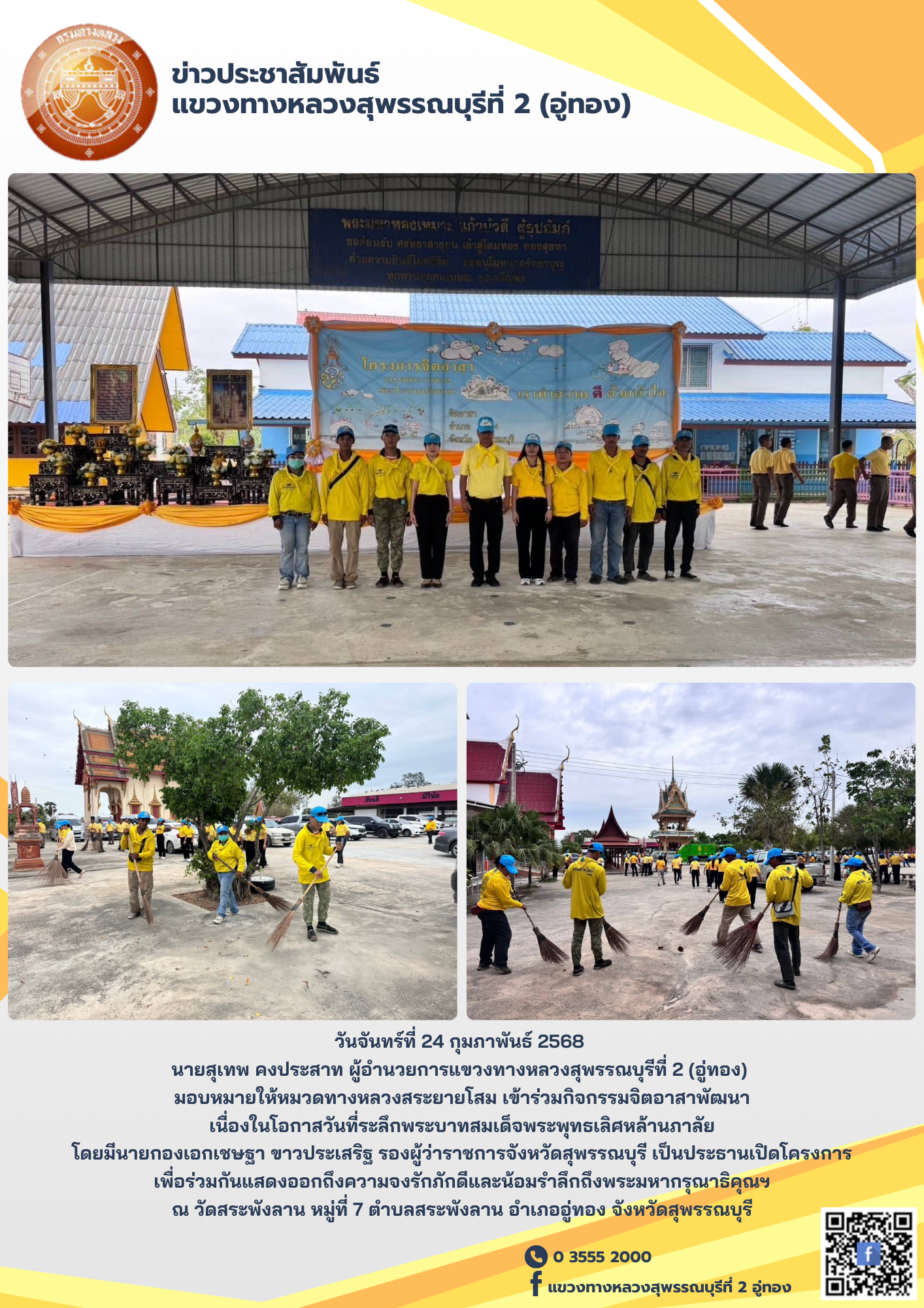 นายสุเทพ คงประสาท ผู้อำนวยการแขวงทางหลวงสุพรรณบุรีที่ 2 (อู่ทอง) มอบหมายให้หมวดทางหลวงสระยายโสม